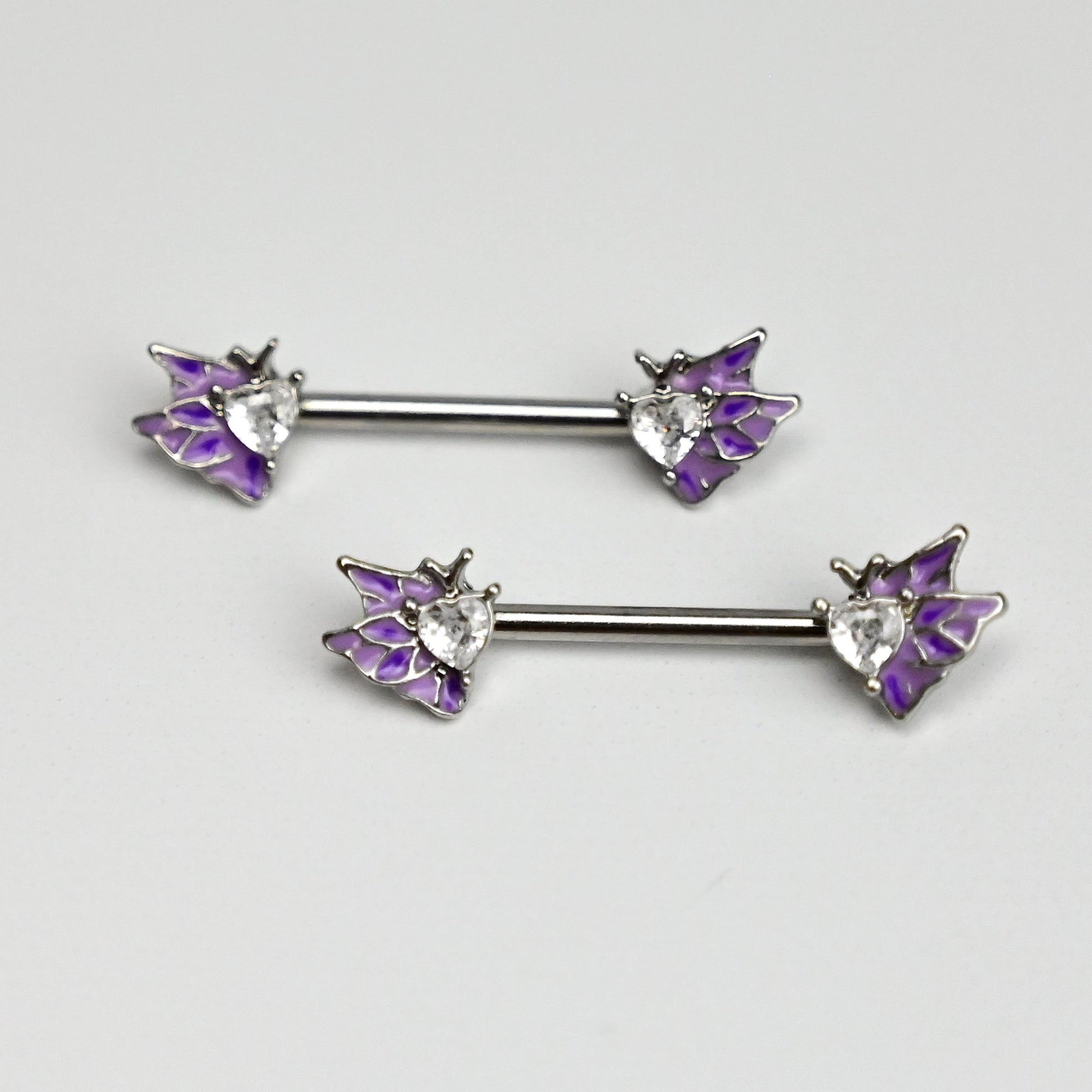 14G 9/16 Clear Gem Heart Butterfly Purple Barbell Nipple Ring Set