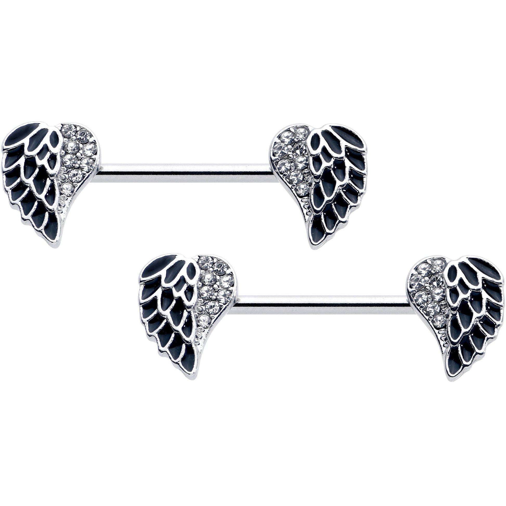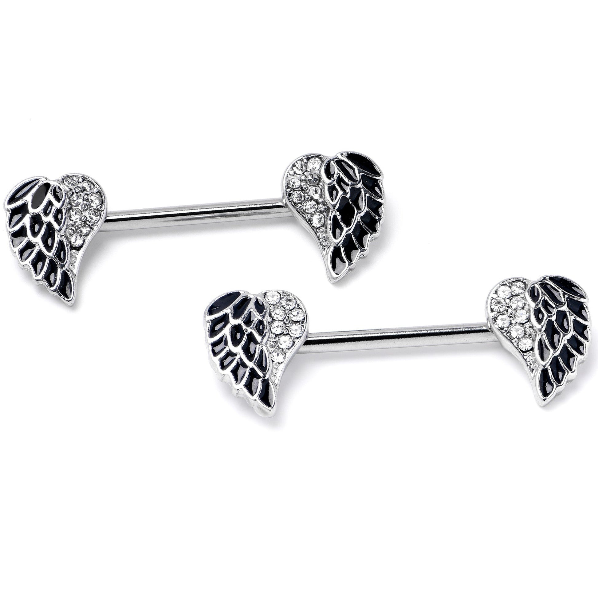 Give yourself a heavenly new look with this 14 gauge nipple jewelry. It's made with 14mm durable 316L surgical grade stainless steel straight barbells. Each of the ends features a heart shaped charm featuring an angel's wings, with one side paved with clear gems. The other sides feature black inlay and simply styled feather details. Let your look and your spirit soar with these stylish and spiritual nipple piercing rings. Sold as a set of two.Specifications