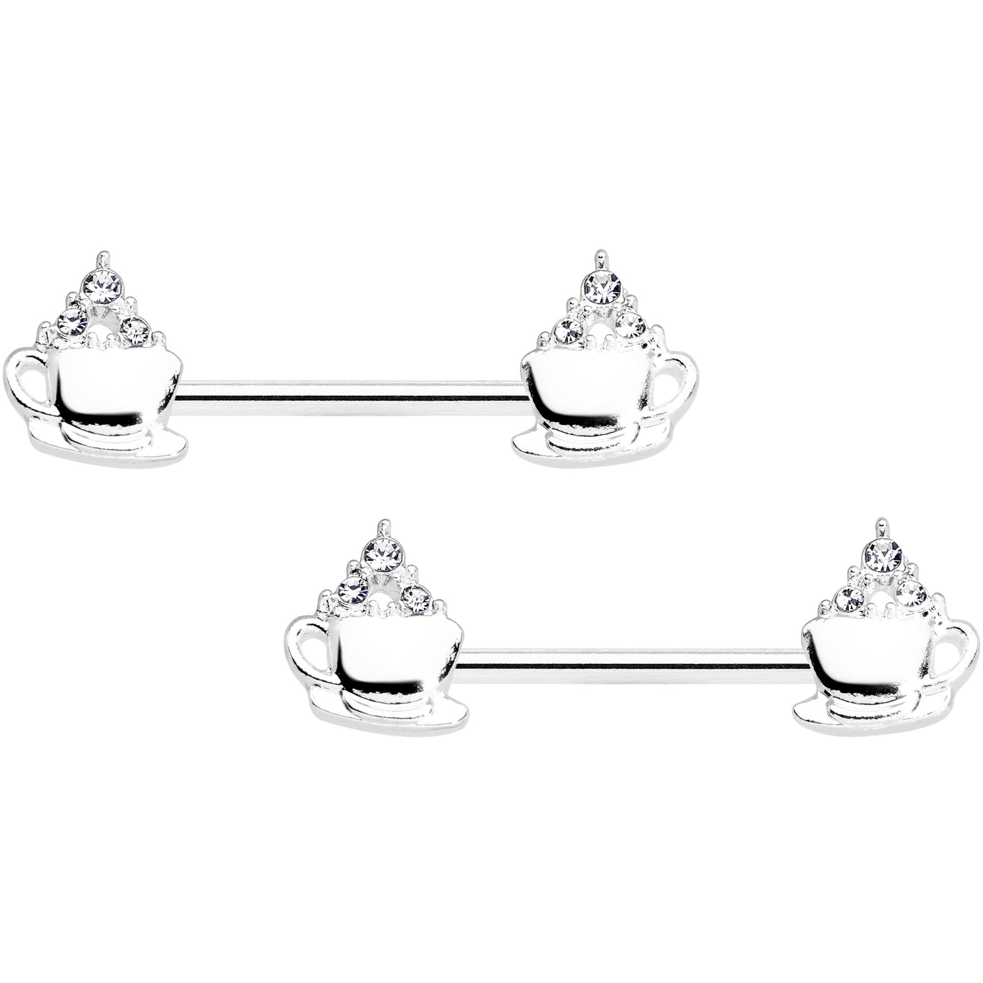 Mmmm......what could be sweeter than a cup of cocoa on a cold day? The sweet cups of cocoa on this 14 gauge nipple jewelry! It's made with 14mm durable 316L surgical grade stainless steel straight barbells with ends that feature matching teacup charms sitting on their own little saucers. Each one appears to be filled to the brim and features small clear gems taking the place of marshmallows floating on the top. These cups of cocoa are sure to make your nipple piercings look absolutely delicious, all year round! Sold as a set of two.Specifications