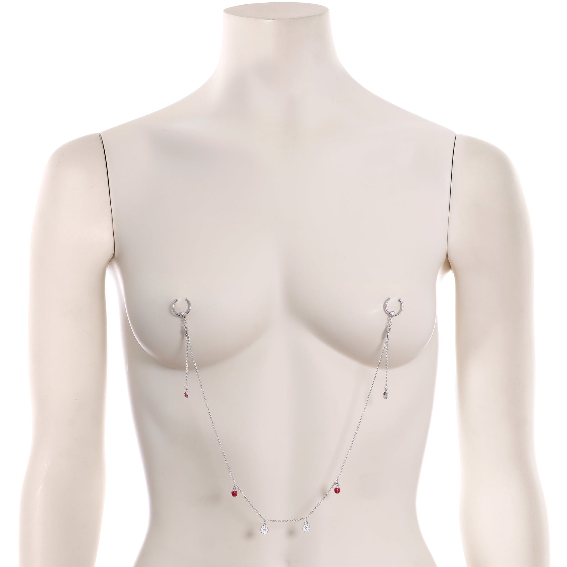 What could be more fun and flirty than the combination of ladybugs and flowers on this 14 gauge nipple jewelry? It's made with 14mm durable 316L surgical grade stainless steel circular rings. The rings have 5mm captive beads which are each set with a small clear gem. Hanging between the two ball closure rings is a 14" length of chain. The chain features white and yellow flower dangle charms as well as three-dimensional red ladybug charms, complete with their black spots. You'll practically feel the spring breeze with these charming dangle nipple rings!Specifications