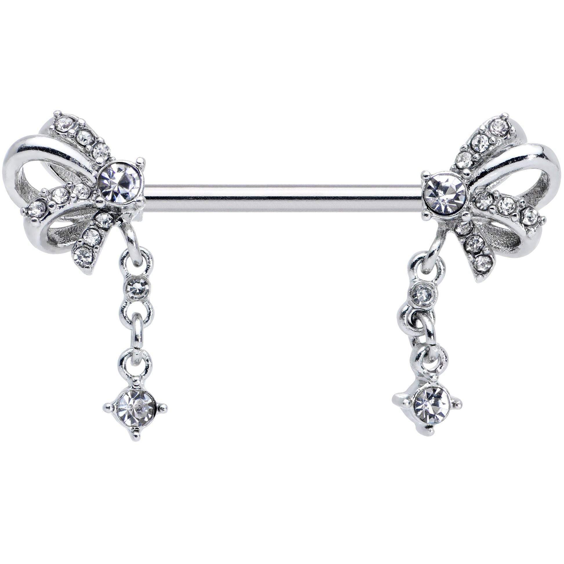 Simple style is simply stupendous on this 14 gauge nipple jewelry! It's made with 14mm durable 316L surgical grade stainless steel straight barbells. Each of the ends features one side of a bow charm, with criss-crossing loops, some of which are paved with clear gems and the rest are left unadorned for contrast. The bows are set with a clear gem at the center to give a coordinated look. Dangling from the bottom is a short length of matching chain, supporting one last clear gem. Wrap your look up with a bow with the simple style of these beautiful bow nipple rings! Sold as a set of two.Specifications