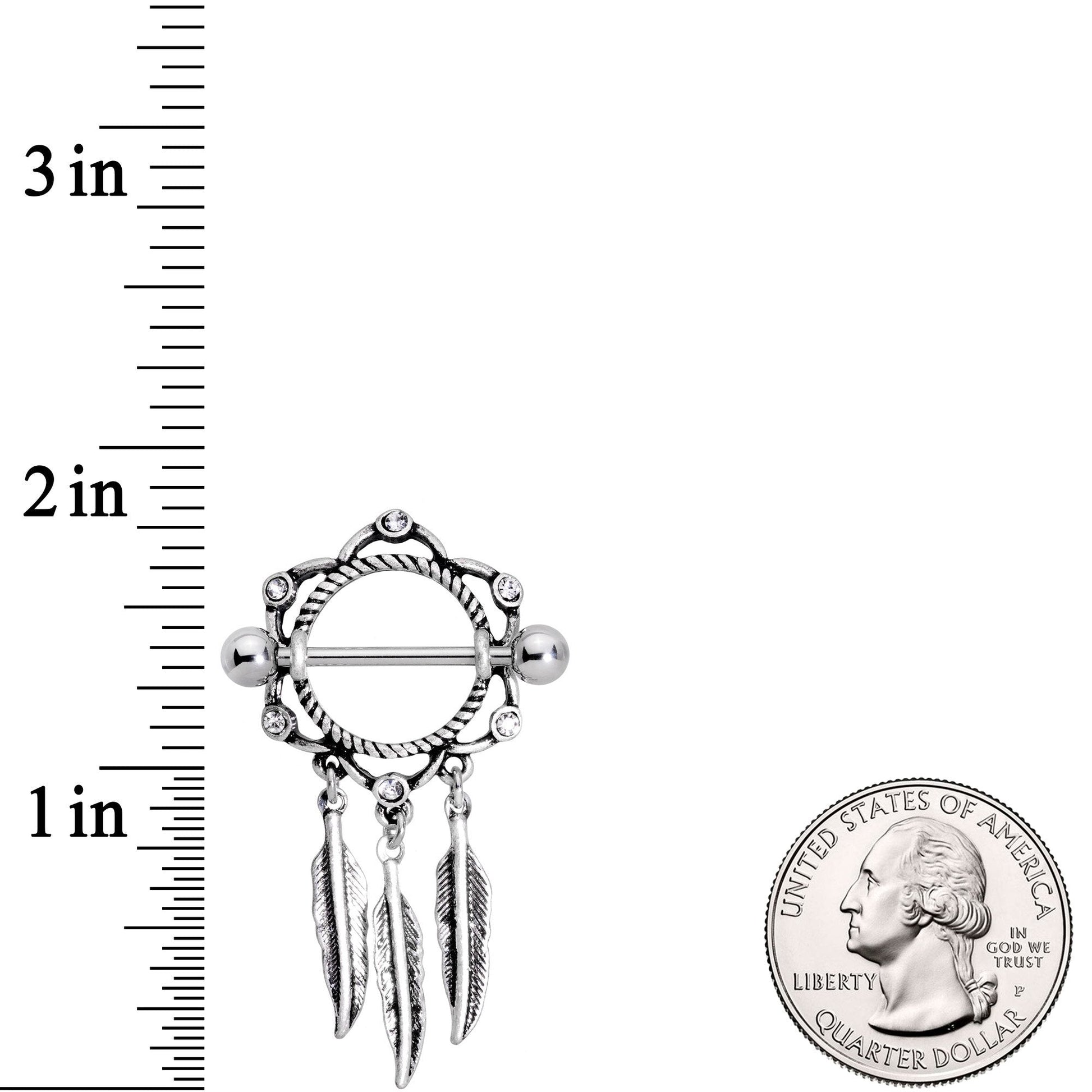 These 14 gauge shield nipple rings pack a lot of thoughtful detail into a small package. They're made with 14mm durable 316L surgical grade stainless steel straight barbells and have 5mm ball ends. The shield portions have a rise of 16mm and a width of 13mm. The shields have an inner circle with a twisted design that gives them depth and texture. The outer ring is shaped like a stylized lotus flower, embellished with small clear gems at each point. These highlight the delicately outlined shape and add visual contrast. Dangling from the bottom are three feathers, their movement drawing the eye and giving the shields a unified feel. If you want to give your piercings the total package, these shields are exactly what you're after. Sold as a set of two.Specifications