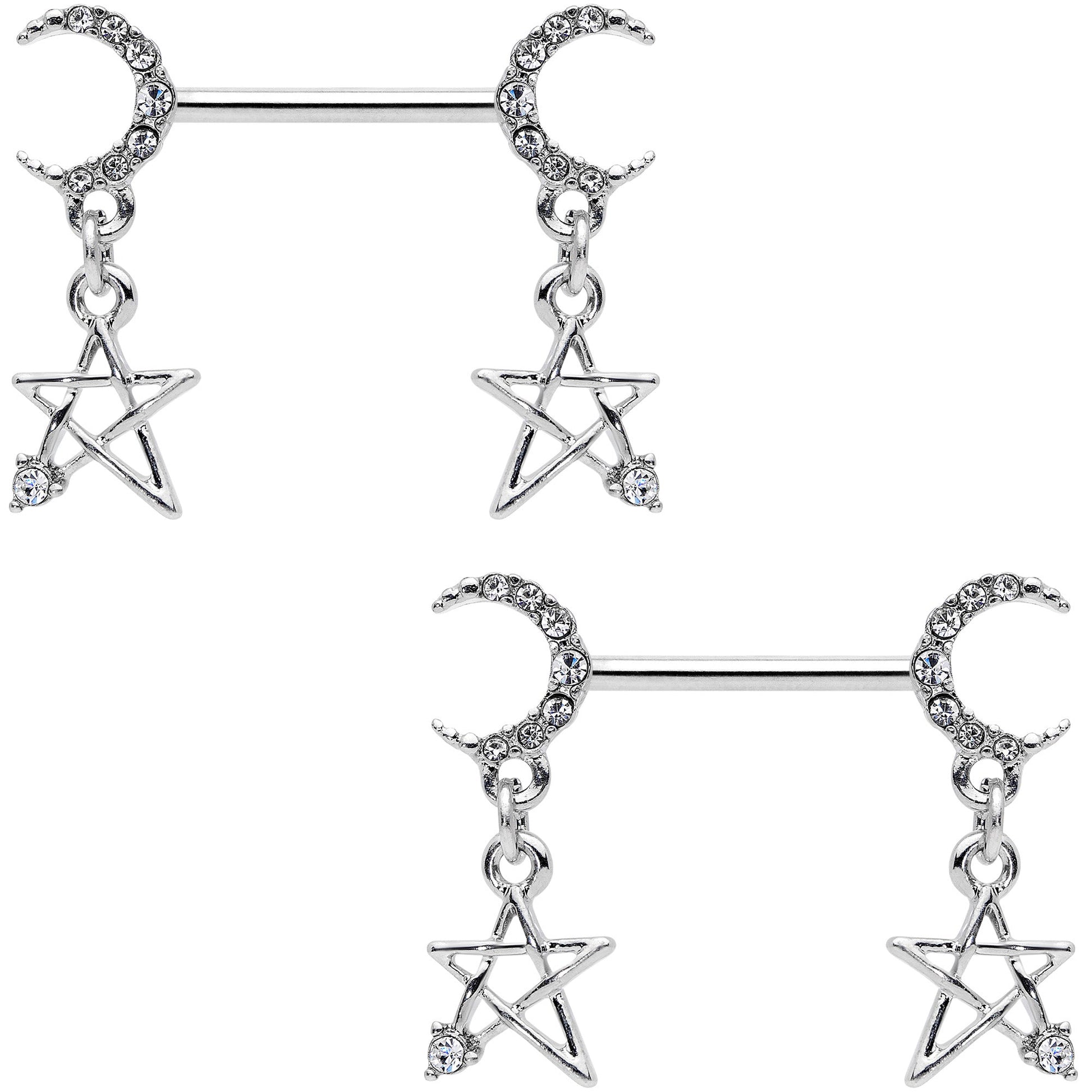 Now you can make moon magic and dance with the stars even during the day with this 14 gauge nipple jewelry! It's made with 14mm durable 316L surgical grade stainless steel straight barbells. The ends of each one feature a crescent moon, paved with small clear gems. The moon also supports a small hanging five-pointed star that has a small clear gem at its bottom right point. The look is both mystical and glamorous, opulent and arcane. So whether you are a bewitching beauty or simply want your nipple piercings to be a star, these nipple rings are bound to brighten up your night! Sold as a set of two.Specifications