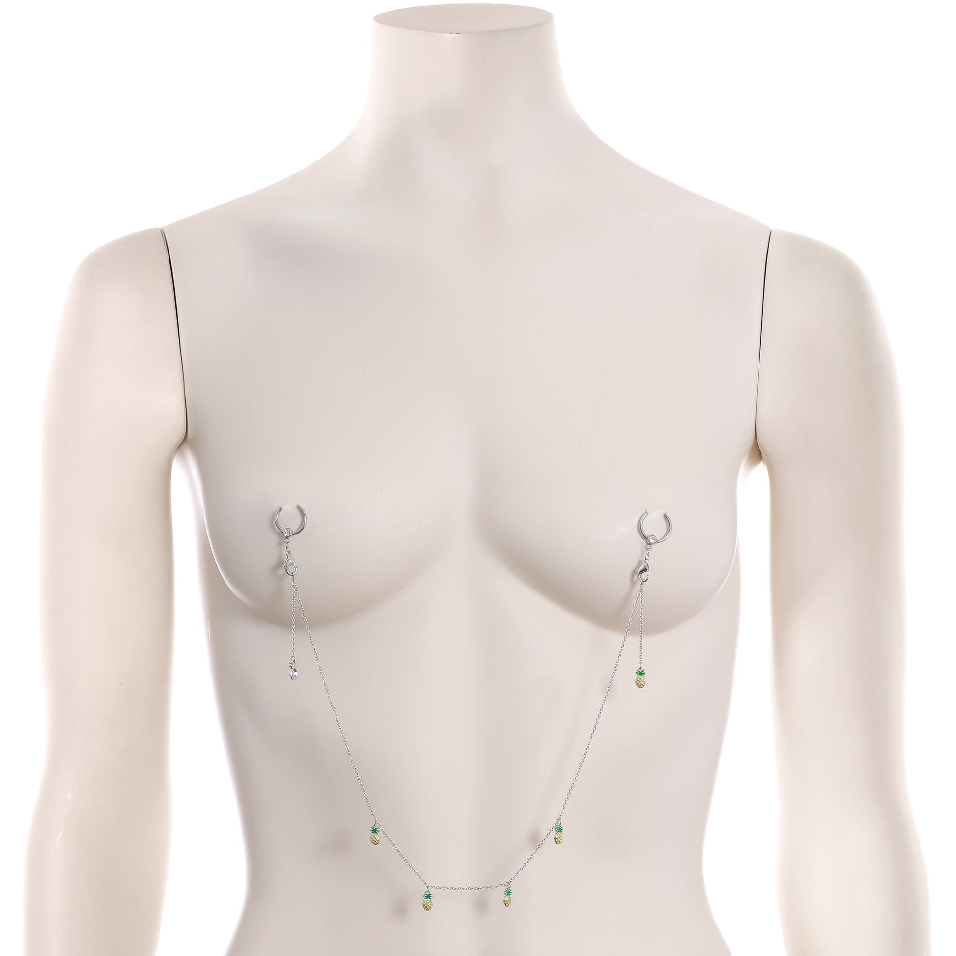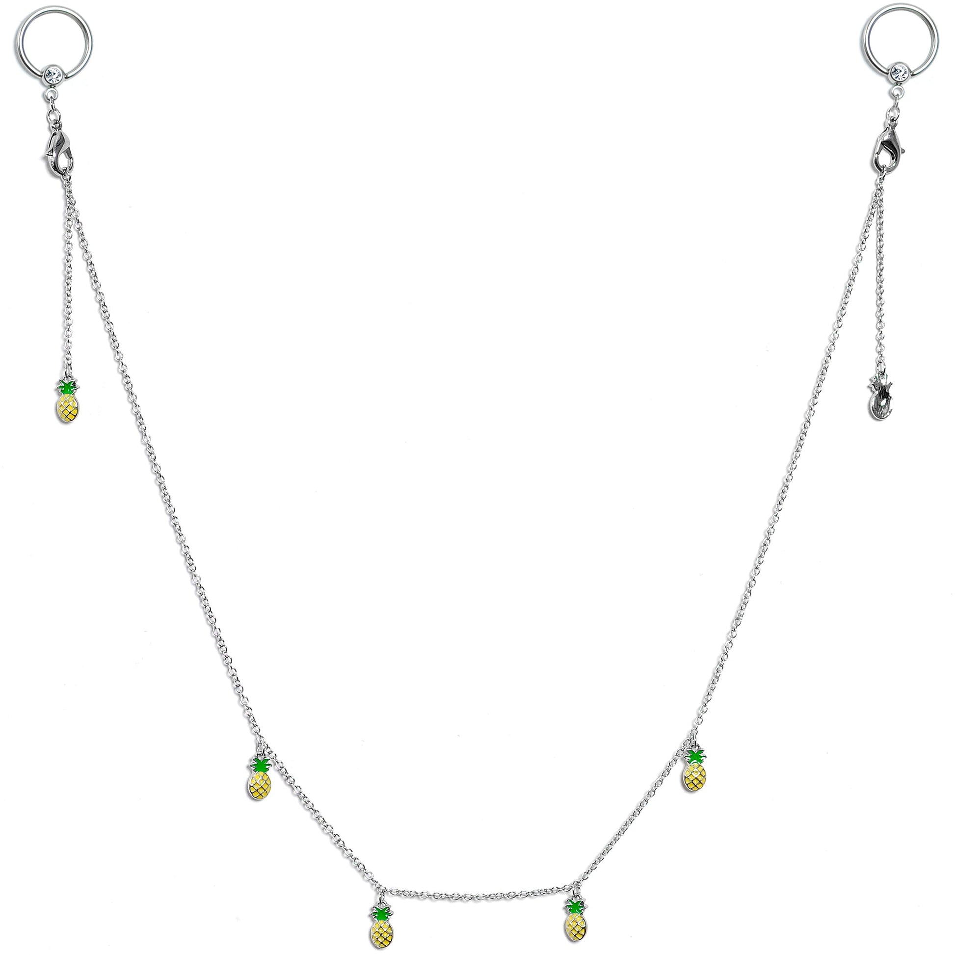 Give yourself a taste of summer any time of year with this 14 gauge tropical pineapple nipple jewelry! It's made with 14mm durable 316L surgical grade stainless steel circular rings. The rings have 5mm captive beads which are set with a single clear gem each. Between the two rings dangles a 14" length of chain that supports a number of dangling tropical pineapple charms. Try finding that in your local produce section!Specifications