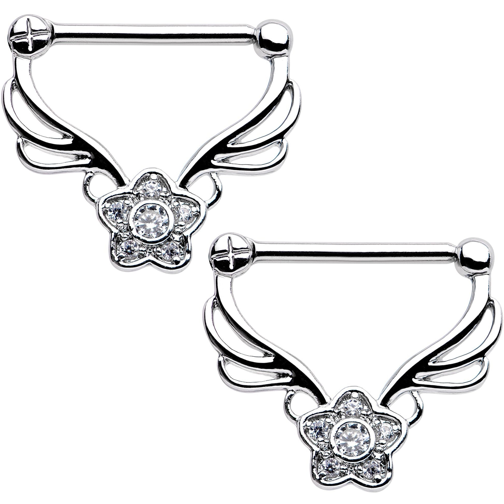 Power up with this beautiful nipple clicker set. Each nipple clicker features a clear gem encrusted star mounted on a fancy metalwork design. This 14 gauge nipple ring set features 14mm long straight hinged barbells made from durable 316L surgical grade stainless steel for easy insertion and removal from your nipple piercing. Sold as a set of two for you!