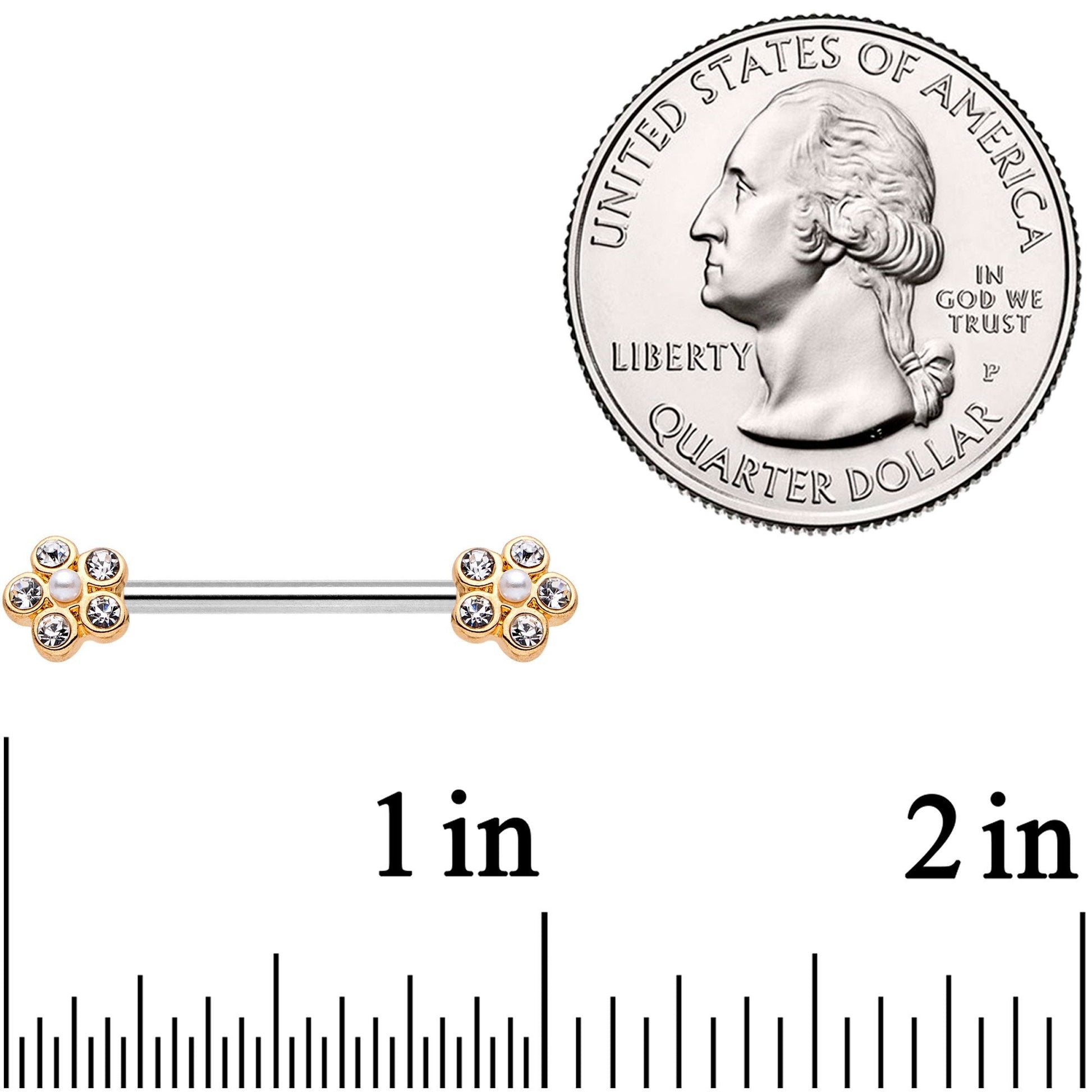 Flowers are nice and so are gems, but both together is the best of all! These nipple barbells are 14 gauge and made with durable 316L surgical grade stainless steel straight barbells. They are tipped with gold tone flowers, made of rich clear gems and capped with a luscious white orb in the center. At 14mm they are the perfect size for you to wear flowers on you every place you go! Sold as a set of two.Specifications