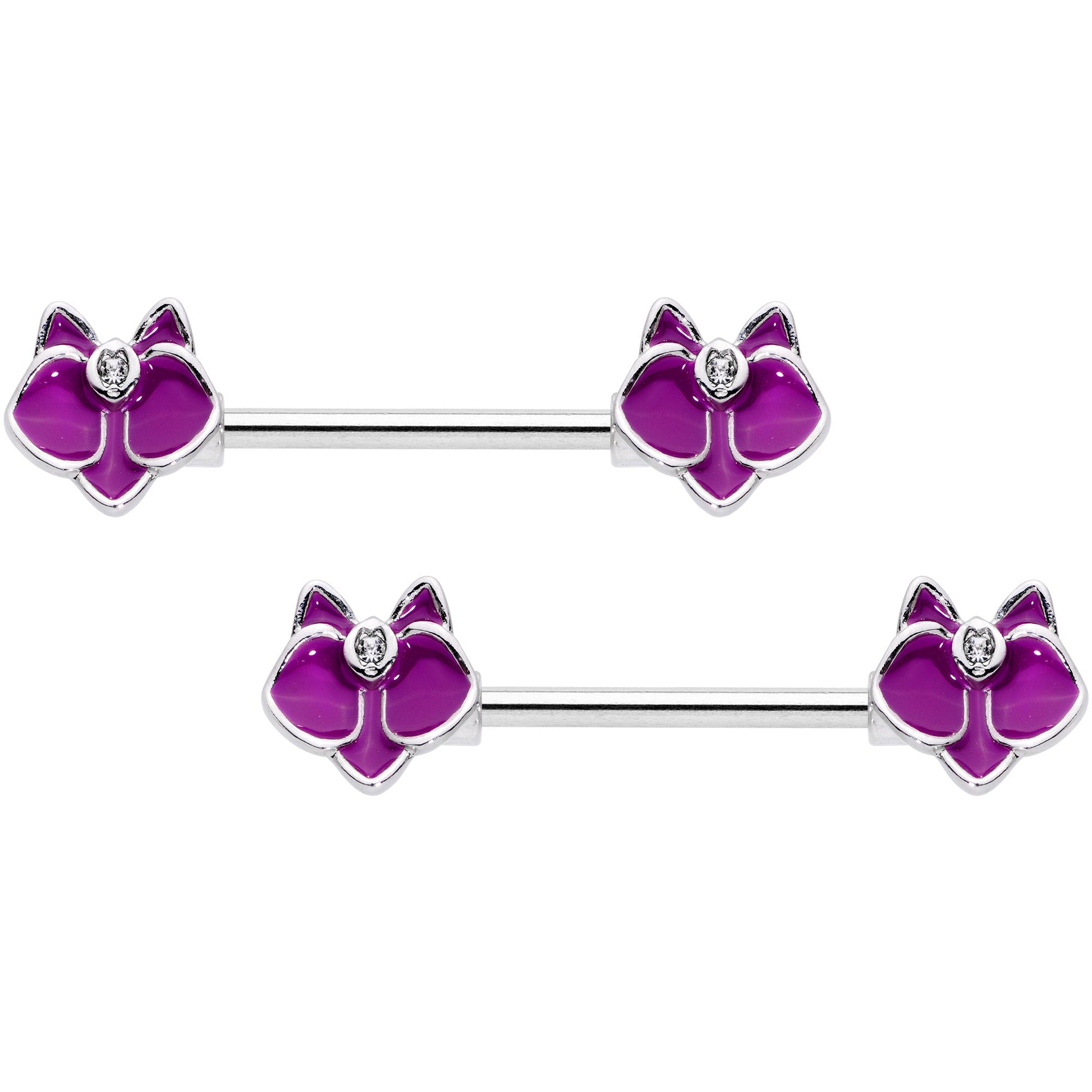 What flower could be more rare, more hauntingly lovely than the orchid? Well, now you can harness that beauty for yourself with these 14 gauge nipple rings. They're made with 14mm durable 316L surgical grade stainless steel straight barbells. The ends feature purple orchid flower charms set with a small clear gem. Add some floral fascination to your nipple piercings with these out-of-sight orchids! Sold as a set of two.Specifications