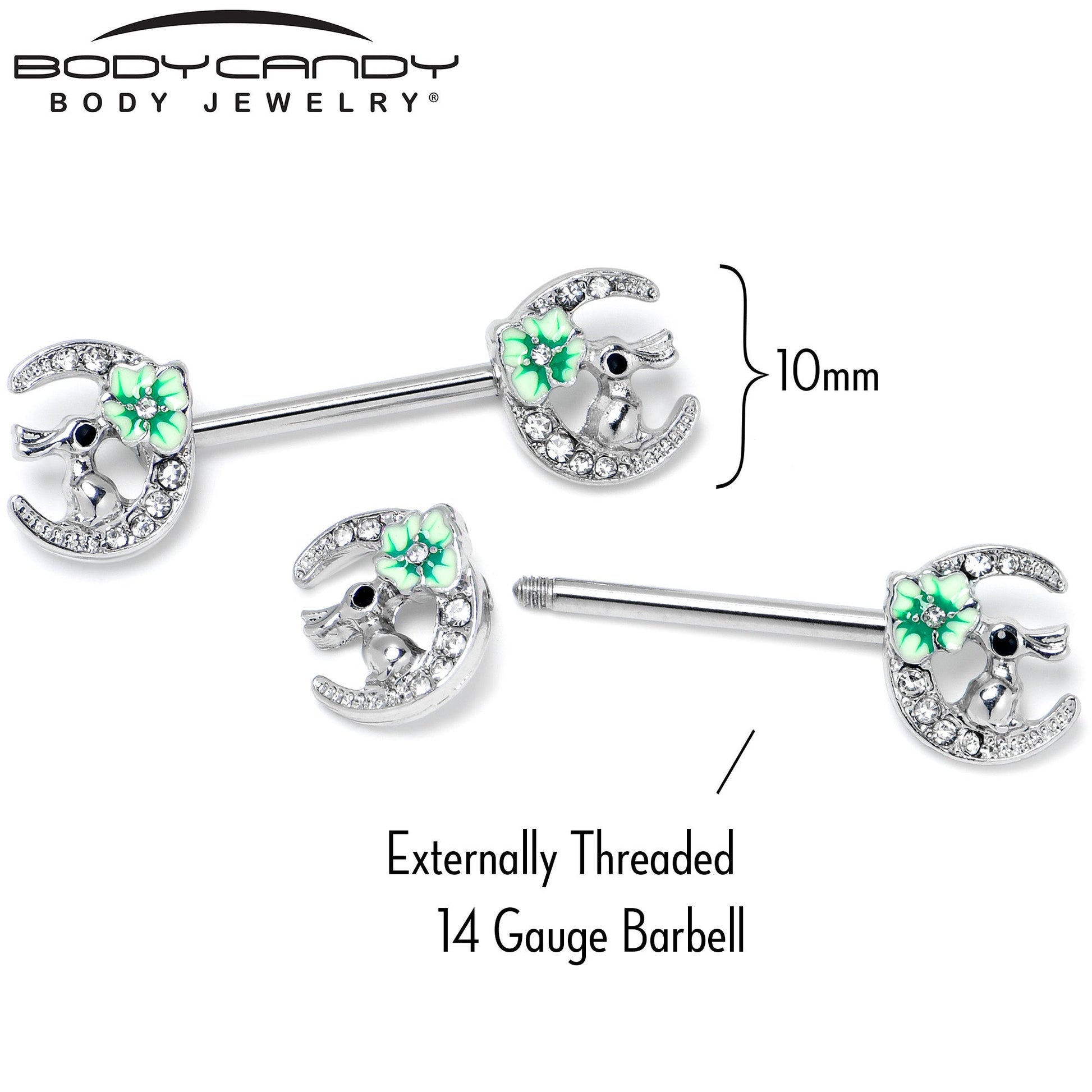 14 Gauge 9/16 Clear Gem Rabbit On Moon Flower Green Nipple Ring Set