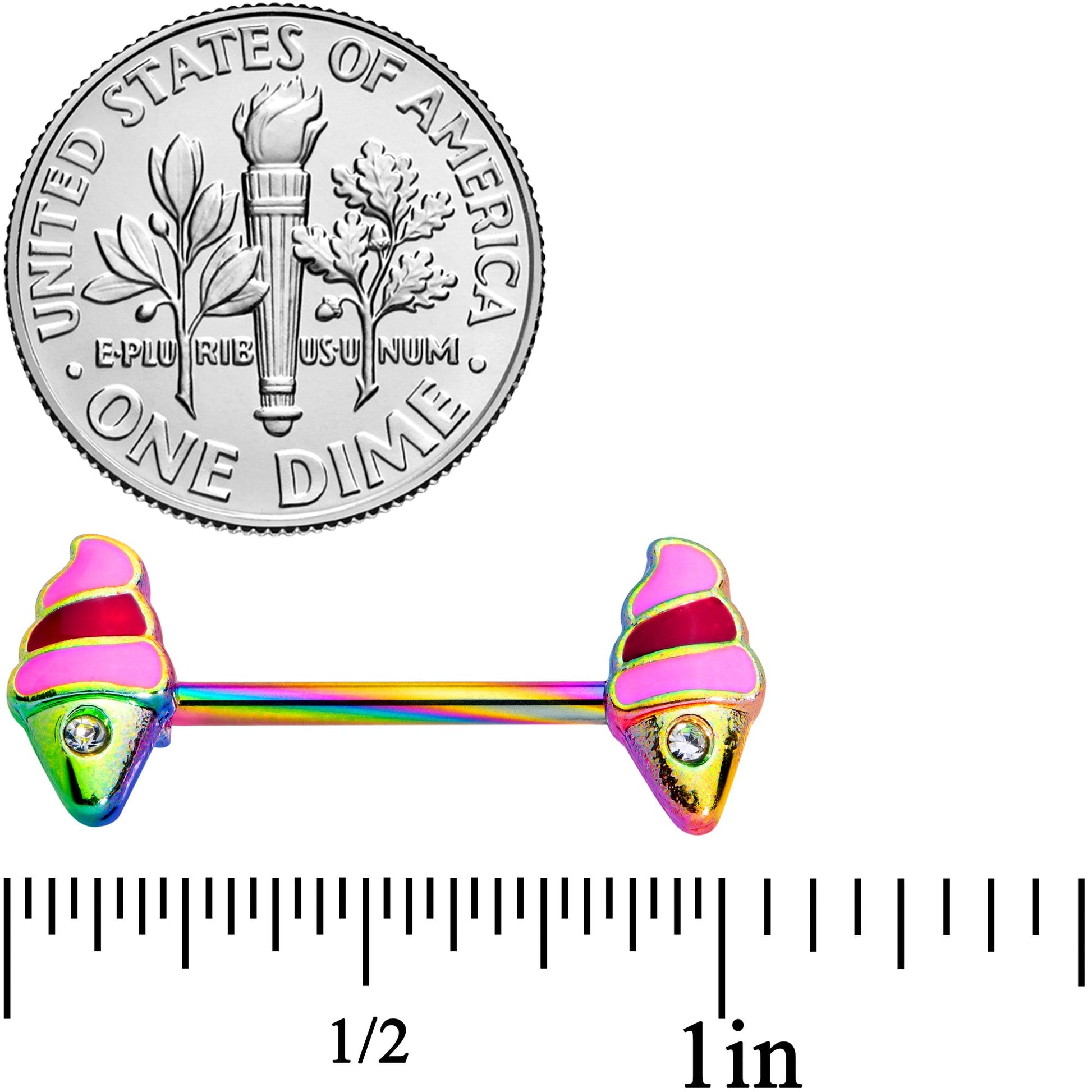 Even the rainbows wish they were as powerfully colorful as this 14 gauge nipple jewelry! It's made with 14mm rainbow plated over 316L surgical grade stainless steel straight barbells. The ends each feature an ice cream cone charm in super-hot shades of pink and purple, with green detailing. If that weren't enough, each ice cream cone is set with a small clear gem for an extra eye-catching look. Let your nipple piercings be the hottest thing in the room this summer with this compellingly colorful nipple jewelry! Sold as a set of two.Specifications