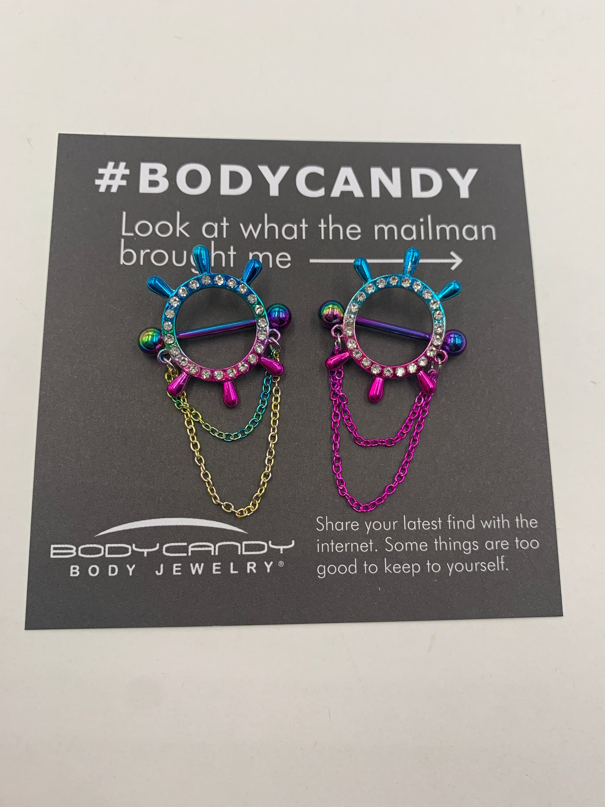 Pull the anchor - it's a beautiful day for sailing and these 14 gauge nipple shields are hot! They're made with 14mm rainbow plated over 316L surgical grade stainless steel straight barbells with 5mm ball ends. The shield portion is made in matching rainbow colors and shaped like a ship's steering wheel, with small clear gems set all around the center. This nipple jewelry is further embellished by a double loop of dangling chain. With these in your nipple piercings, you'll be aching to get out on the water! Sold as a set of two.Specifications