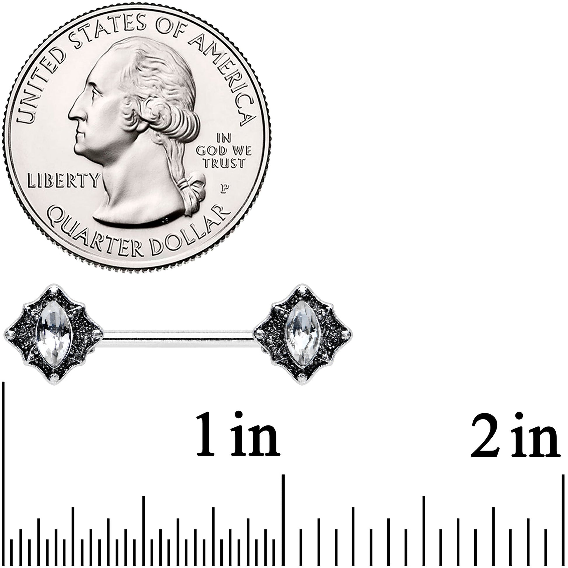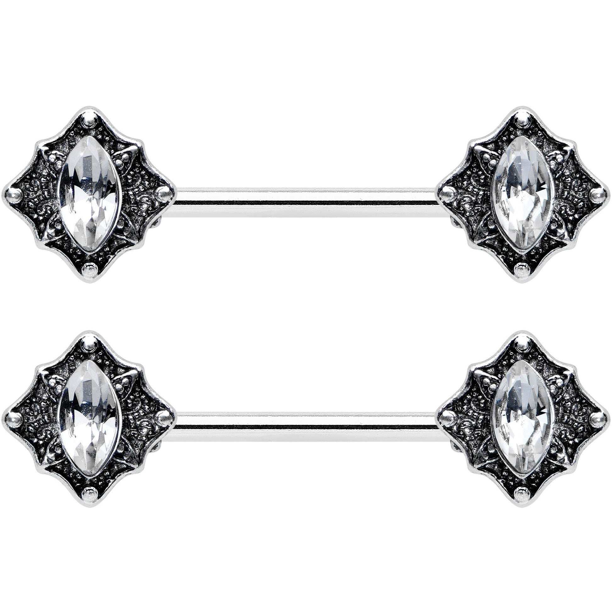 Get ready for regal style when you rock the rhombuses on this 14 gauge nipple jewelry! It's made with 14mm durable 316L surgical grade stainless steel straight barbells. each of the ends features a rhombus charm with textured embellishment. They are further embellished with a clear gem oval set into the rhombuses. Your nipple piercings will rule in elegant fashion with these regal rhombus nipple rings! Sold as a set of two.Specifications