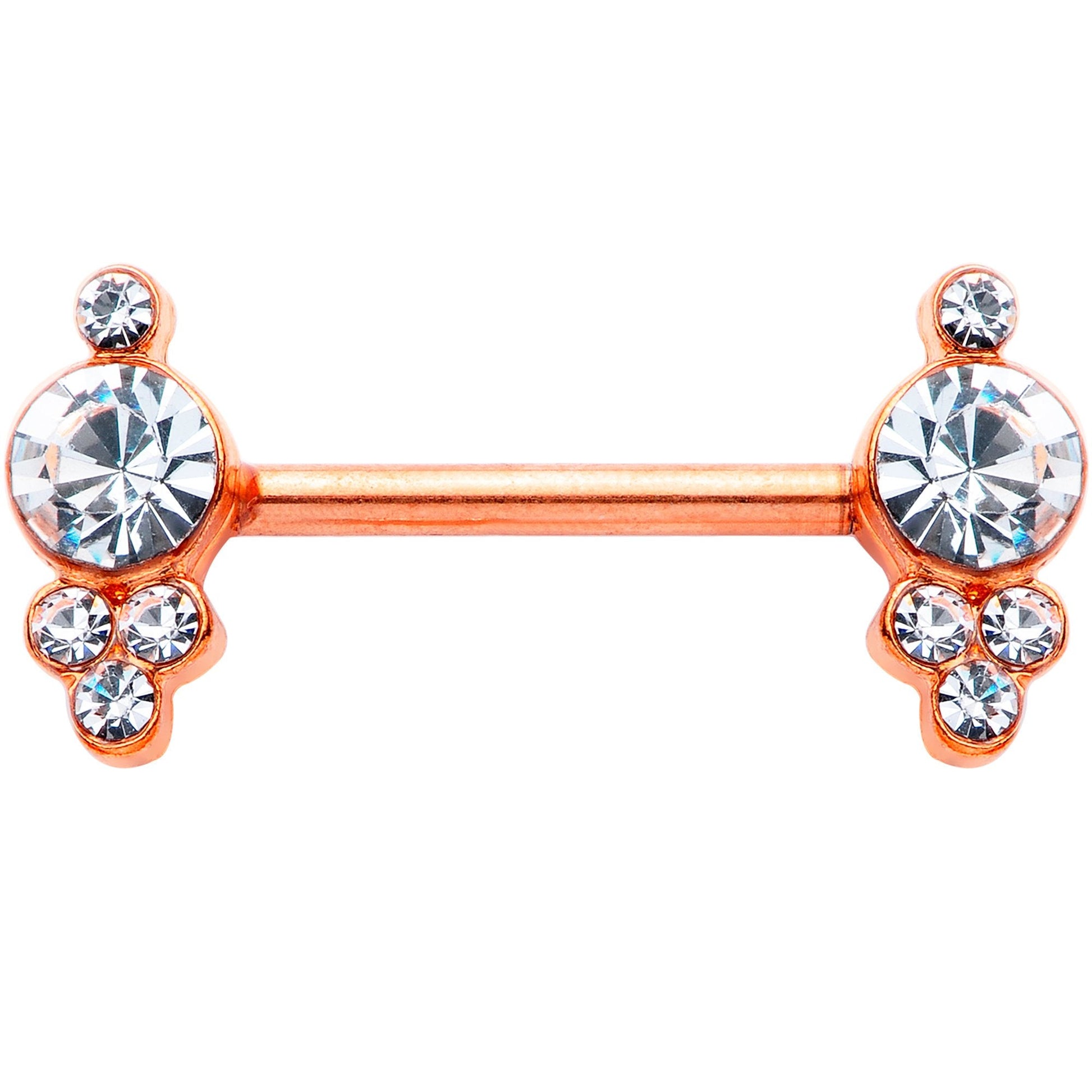 This set of 14 gauge nipple jewelry will leave your head spinning in circles with its elegant styling! Made with 14mm rose gold tone PVD over 316L surgical grade stainless steel straight barbells, these nipple rings have ends made up entirely of clear gems. The central one is the largest with a single small one on one side and three small ones stacked in a triangle shape on the other. The simplicity is perfectly refined for a polished appearance that doesn't skimp on style. If you're looking for a minimalist appearance that isn't boring, there's no need to just go around in circles searching anymore. These are exactly what you're looking for. Sold as a set of two.Specifications
