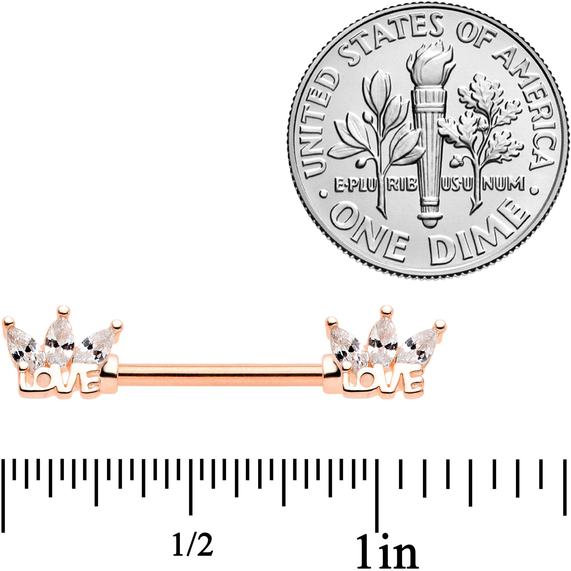Show the world this Valentine's Day that love is king...or queen...with this 14 gauge nipple jewelry! It's made with 14mm rose gold tone plated over 316L surgical grade stainless steel straight barbells. The end of each one features a trio of clear gems, fanned out like a for an airy appearance. They sit atop the word "love" like a royal crown. Spread love when you wear love with these elegant and timely nipple piercing rings! Sold as a set of two.Specifications
