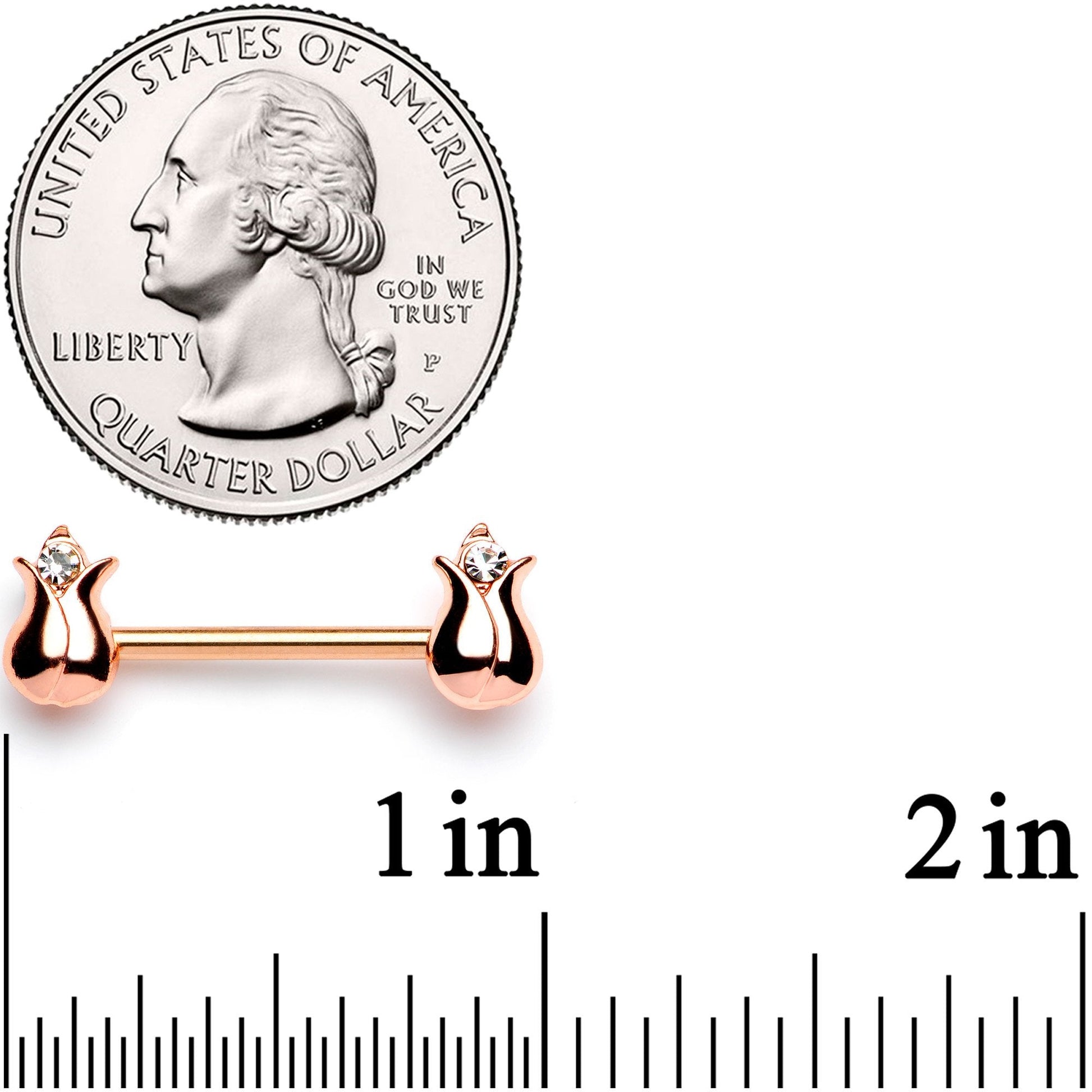 Generally, you have to wait for springtime to enjoy the tulips but now you can enjoy them all year long. Set at their tops with a clear gem, these nipple rings are 14 gauge and made with rose gold tone over durable 316L surgical grade stainless steel straight barbells. They are 14mm for the perfect balance of style and subtlety. With these beauties, it's always time for tulips! Sold as a pair.Specifications