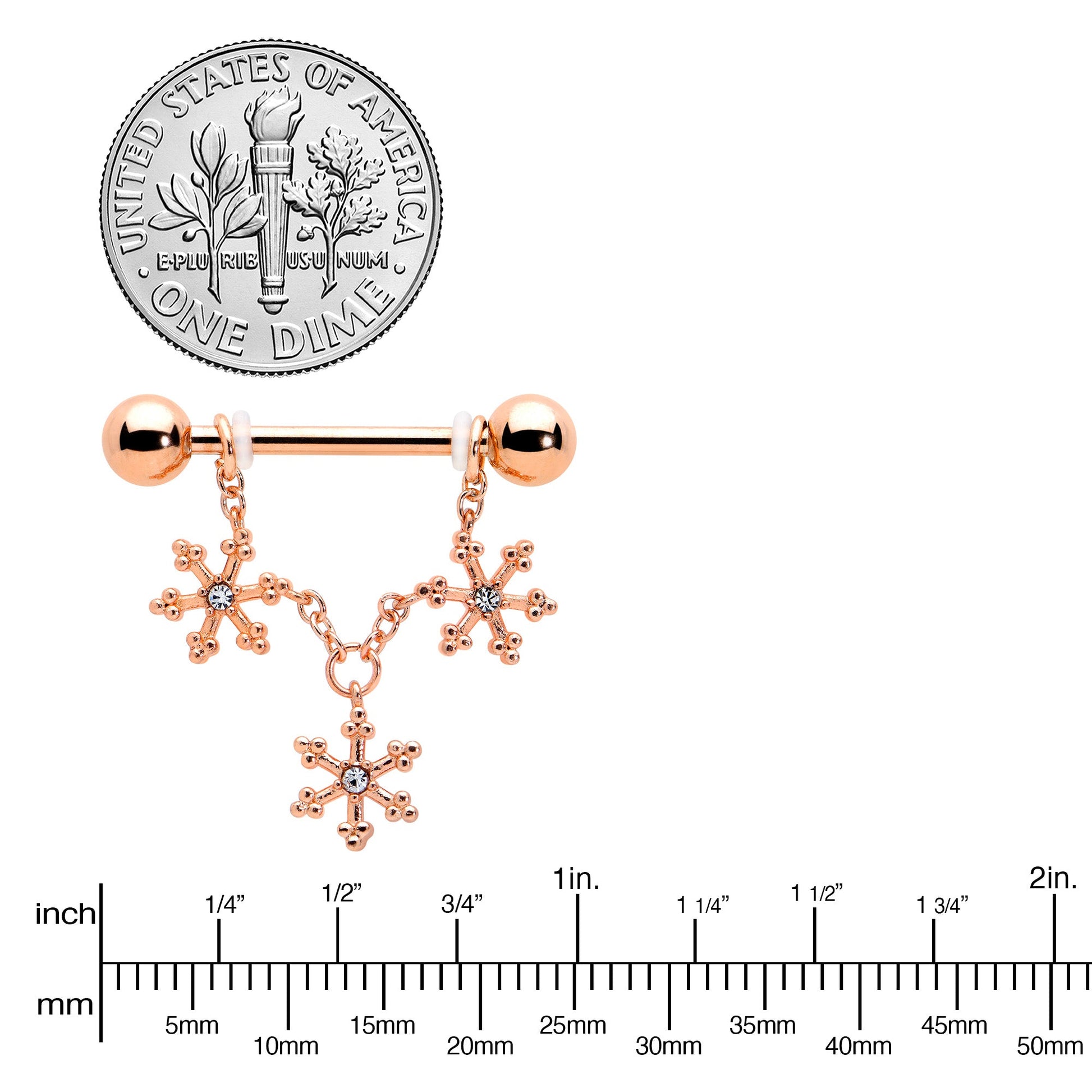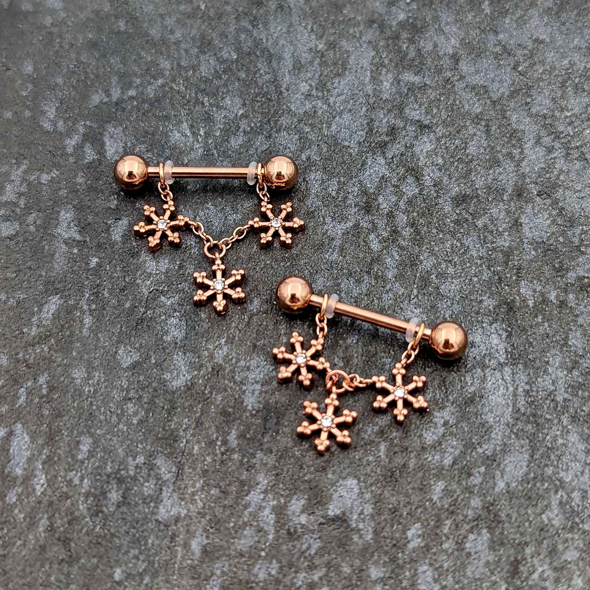 The snowflakes on this 14 gauge nipple jewelry won't melt, but they just might melt your heart! It's made with 14mm wearable length rose gold tone PVD over 316L surgical grade stainless steel straight barbells with 5mm ball ends. They each feature a length of matching chain, supporting a trio of snowflake charms, with textured detailing and clear gems set at the center. How could you leave them out in the cold? Sold as a set of two.Specifications