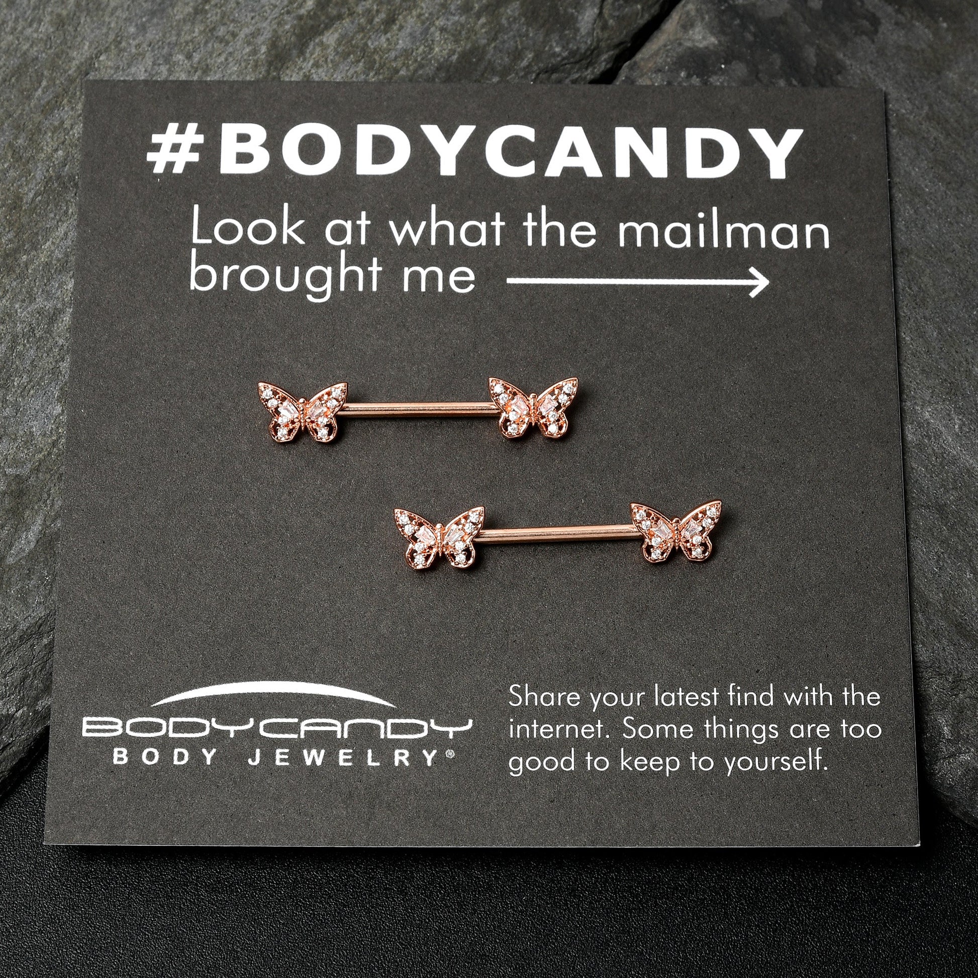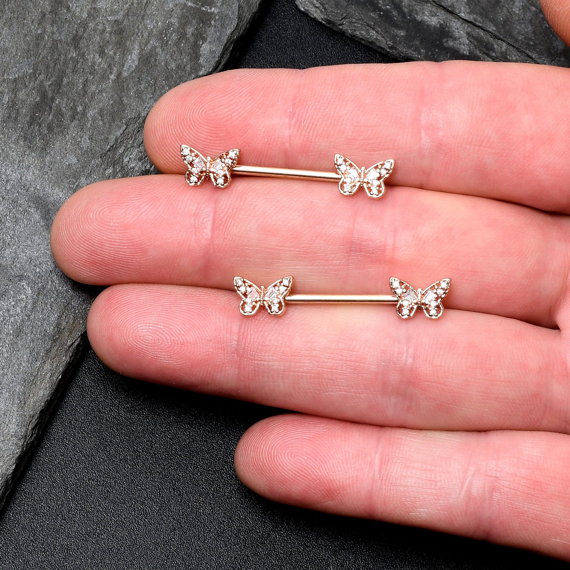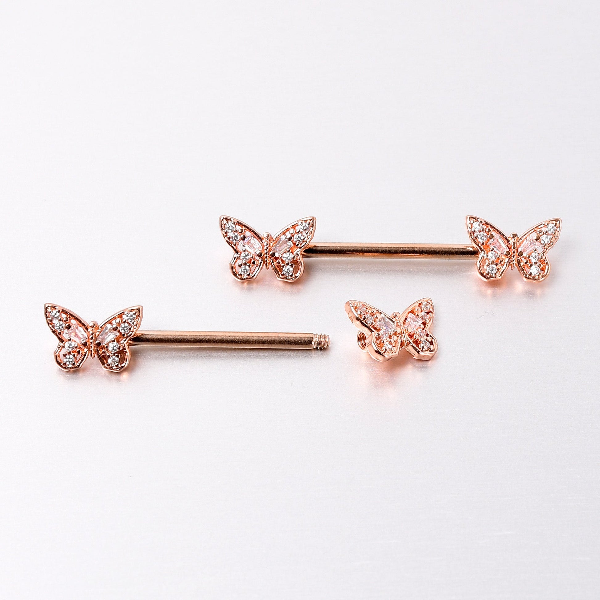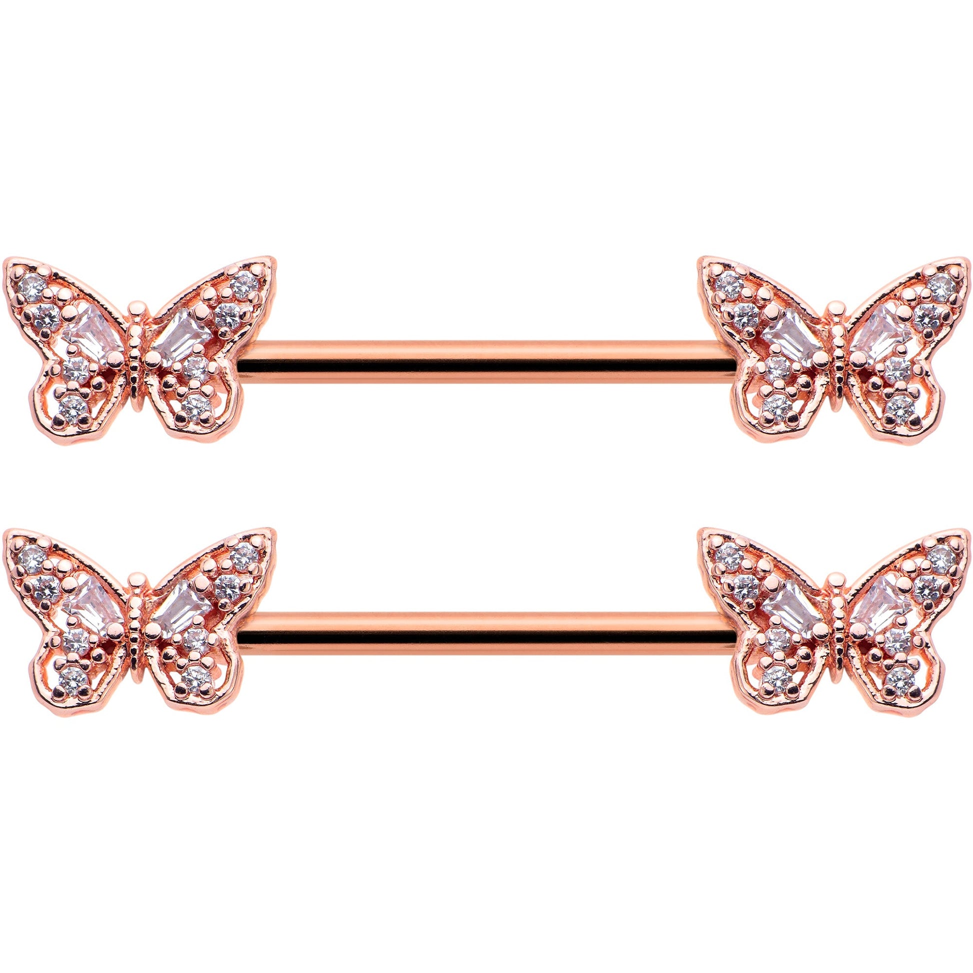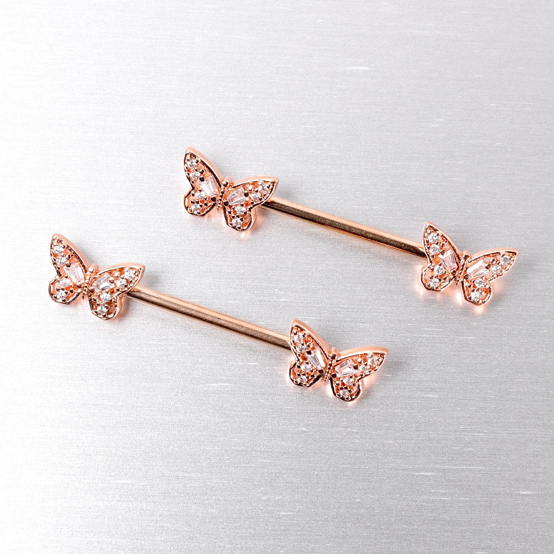 The butterflies on this 14 gauge nipple jewelry will make you want to go for baroque. It is made with 14mm rose gold tone PVD over 316L surgical grade stainless steel straight barbells. Each of the ends features a butterfly charm, with openwork wings for an airy feel. The butterflies are further embellished with clear gems for an ornate appearance you are sure to love. These rococo butterfly nipple piercing rings will make you want to fly. Sold as a set of two.Specifications