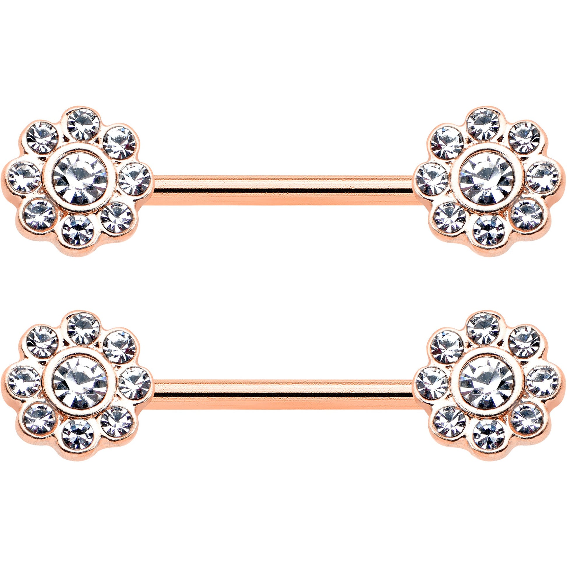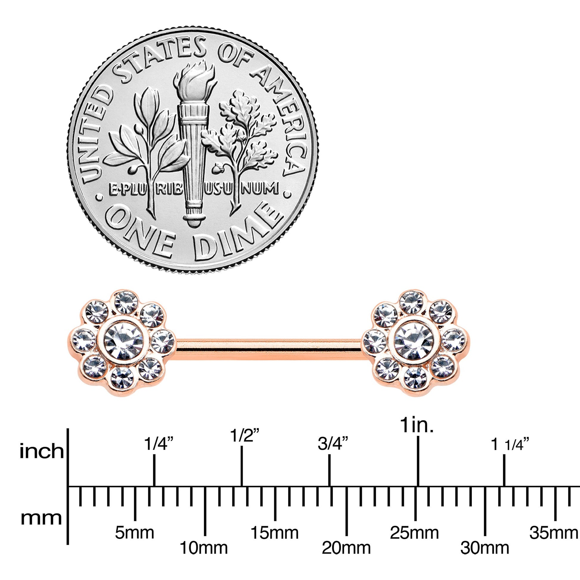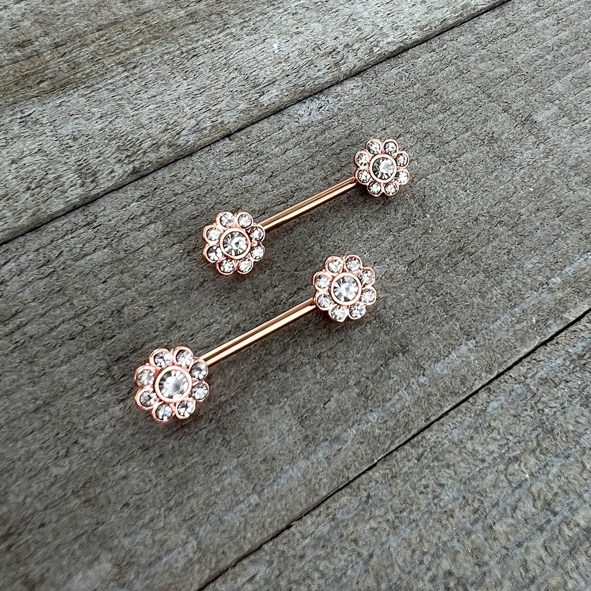 Add some floral whimsy to your look with this 14 gauge nipple jewelry! It's made with 14mm rose gold tone electroplate over 316L surgical grade stainless steel straight barbells. Each of the ends features a cheery flower charm, with the center and petals all composed of individual clear gems. The overall look is charmingly upbeat. You'll bring a smile to everyone's face when you're rocking these endearing floral nipple piercing rings! Sold as a set of two.Specifications