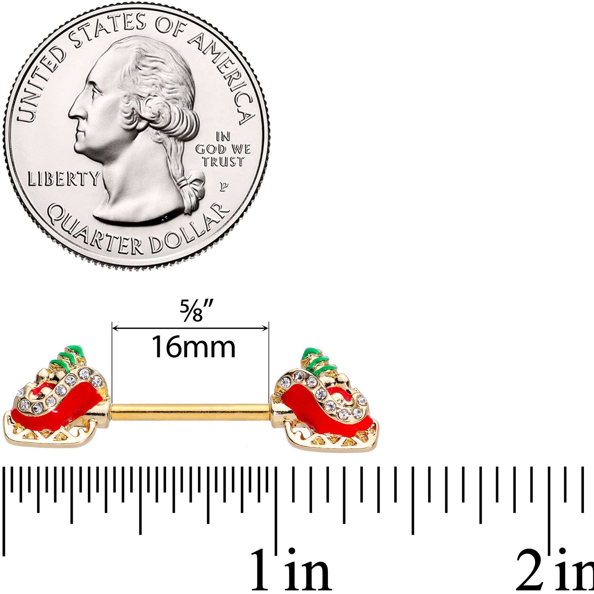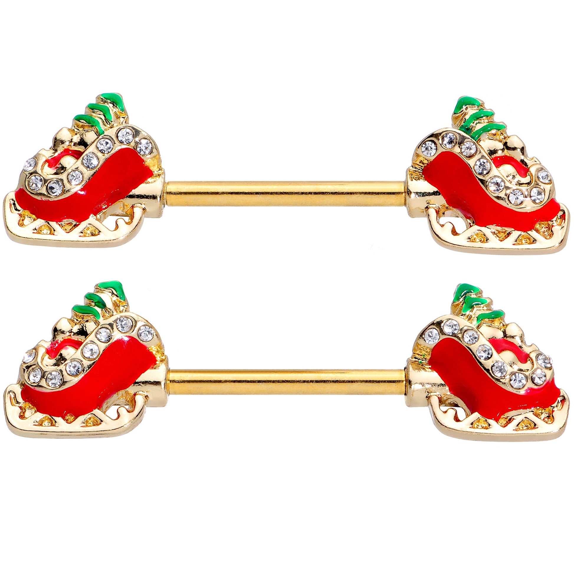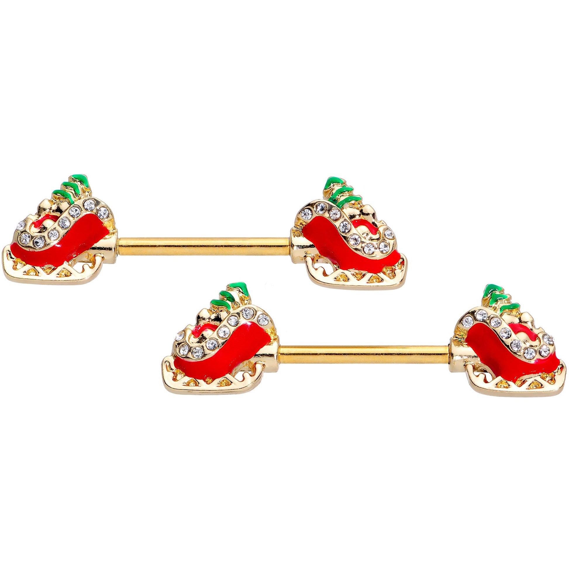 Get ready to be whisked away by Santa on his sleigh when you wear this pair of 14 gauge holiday nipple piercings. Made with 14mm gold tone PVD over 316L surgical grade stainless steelstraight barbells, this nipple jewelry features Santa's sleigh charm ends set with clear gems and is sold as a set of two!Specifications