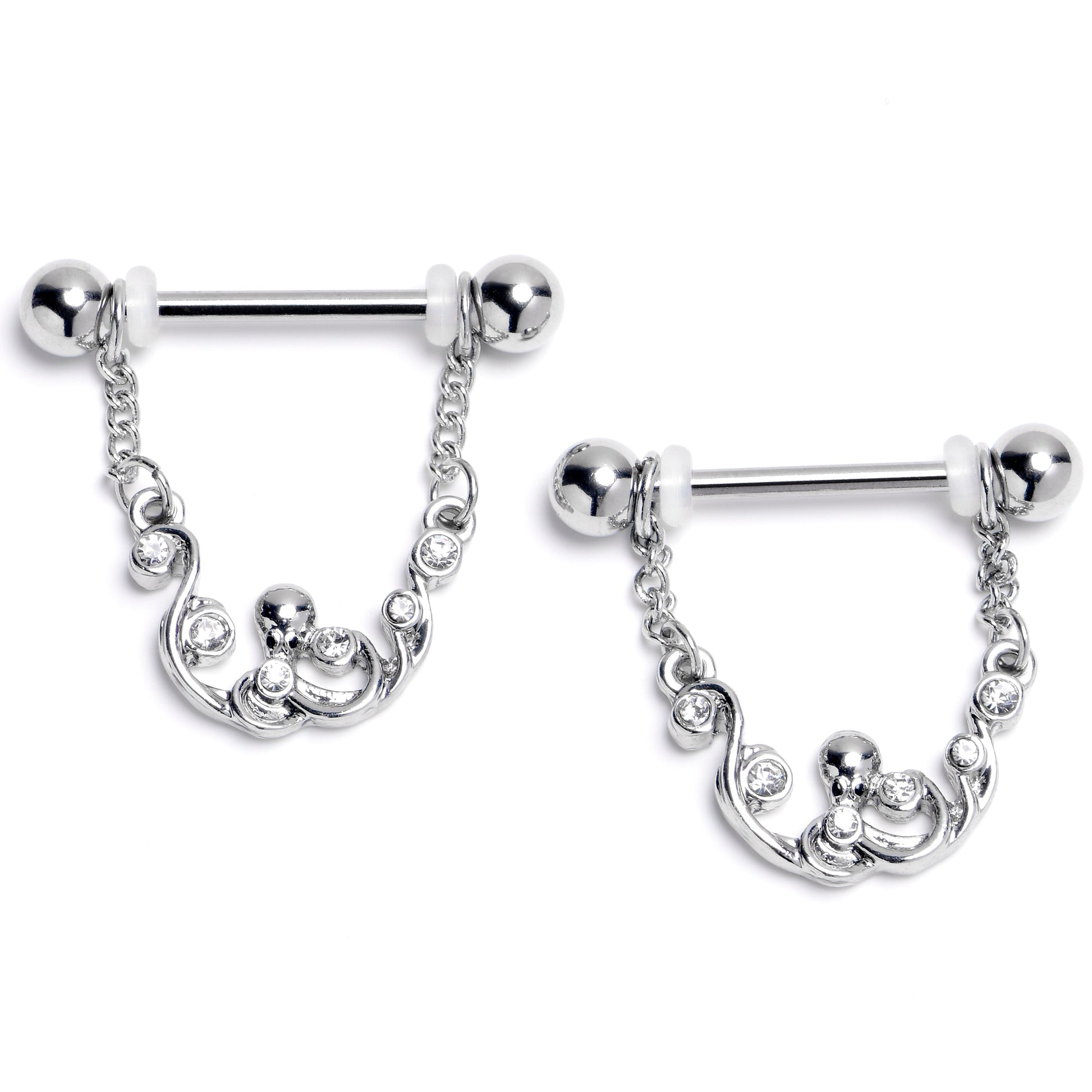 Get stylish with the scrollwork on this 14 gauge nipple jewelry. It is made with 14mm durable 316L surgical grade stainless steel straight barbells with 5mm ball ends. Each barbell features a double length of dangling chains that support scrollwork charms, set with round clear gems. These nipple piercing rings are ones you will not want to just scroll past. Sold as a set of two.Specifications