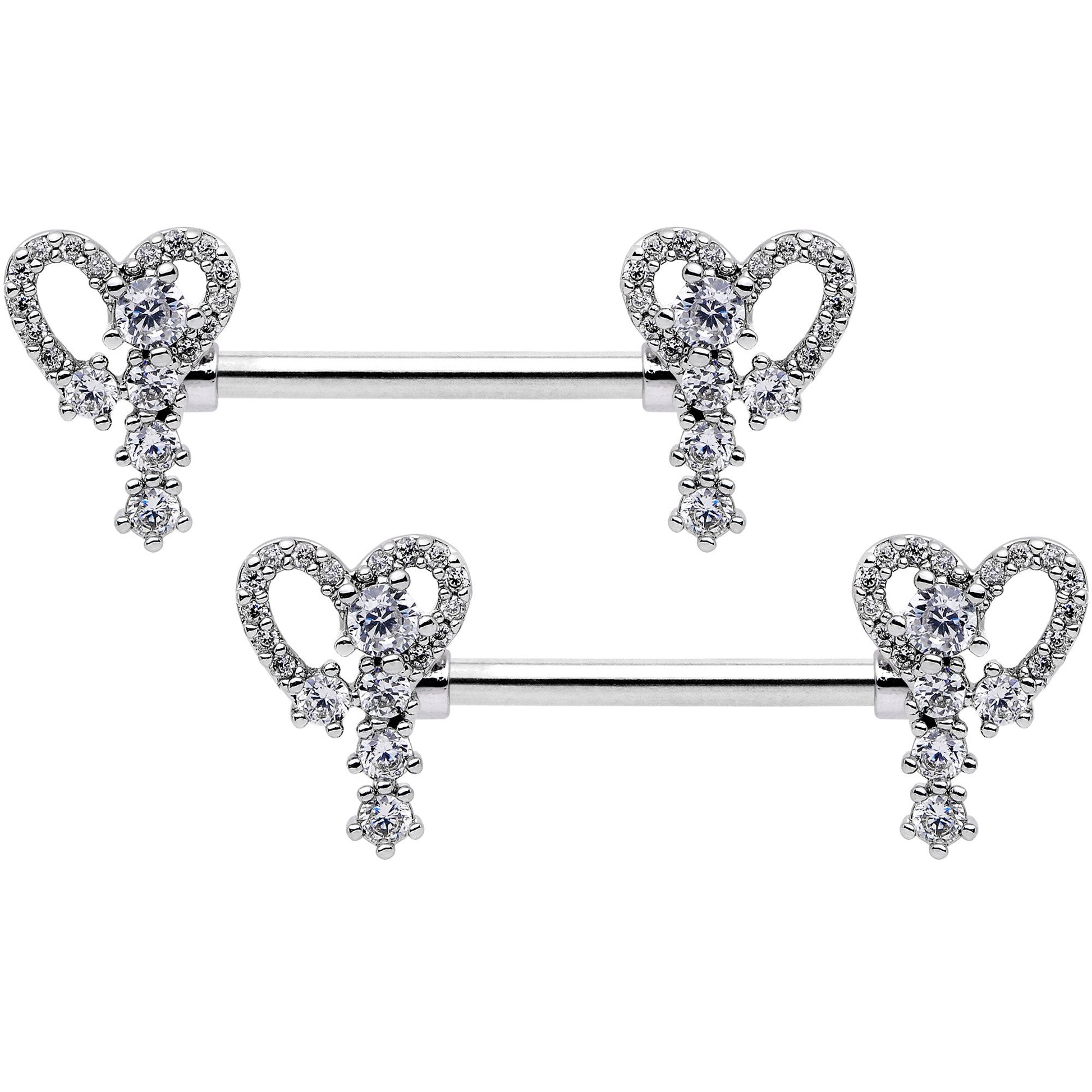 Make Valentine's Day any day when you wear this pretty 14 gauge nipple jewelry! This set of nipple piercings is made with 14mm durable 316L surgical grade stainless steel straight barbells. The ends are shaped like hearts, formed from individual clear gems and embellished further with a line of clear gems that hang from them. You're bound to fall in love! Sold as a set of two.Specifications