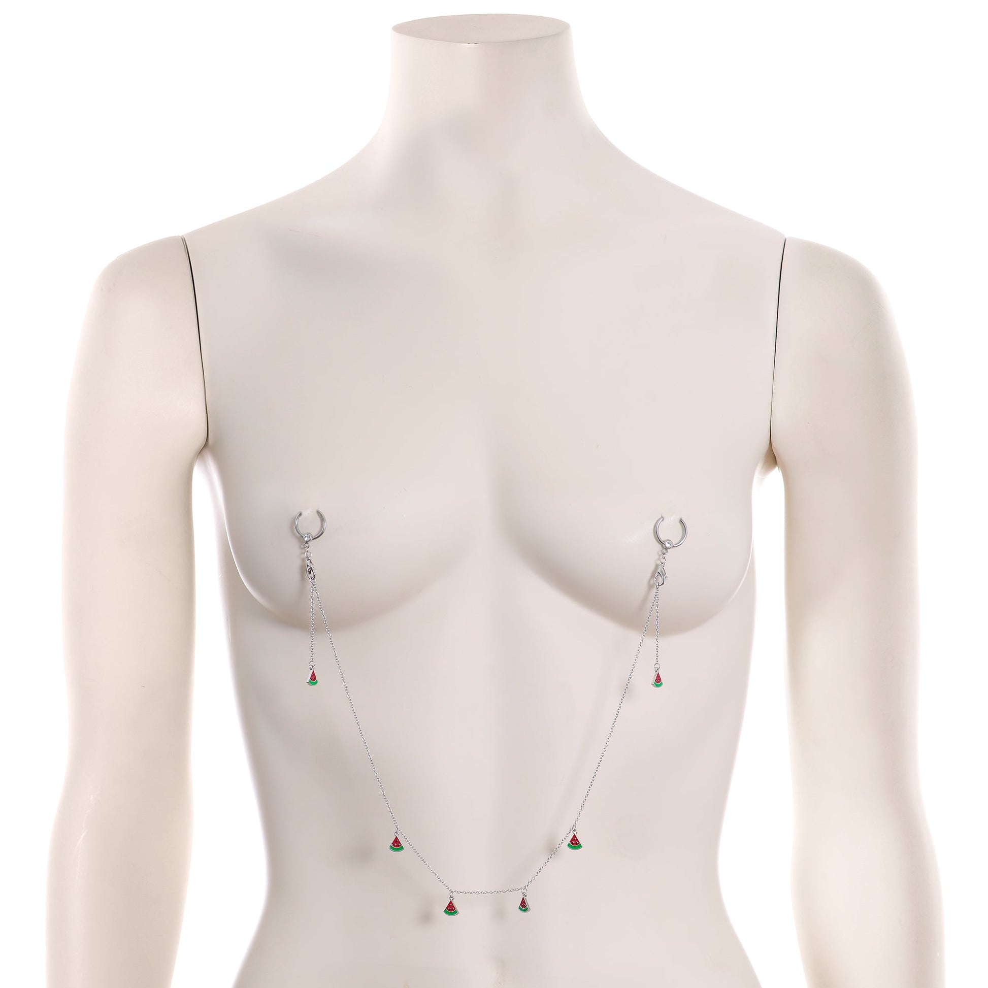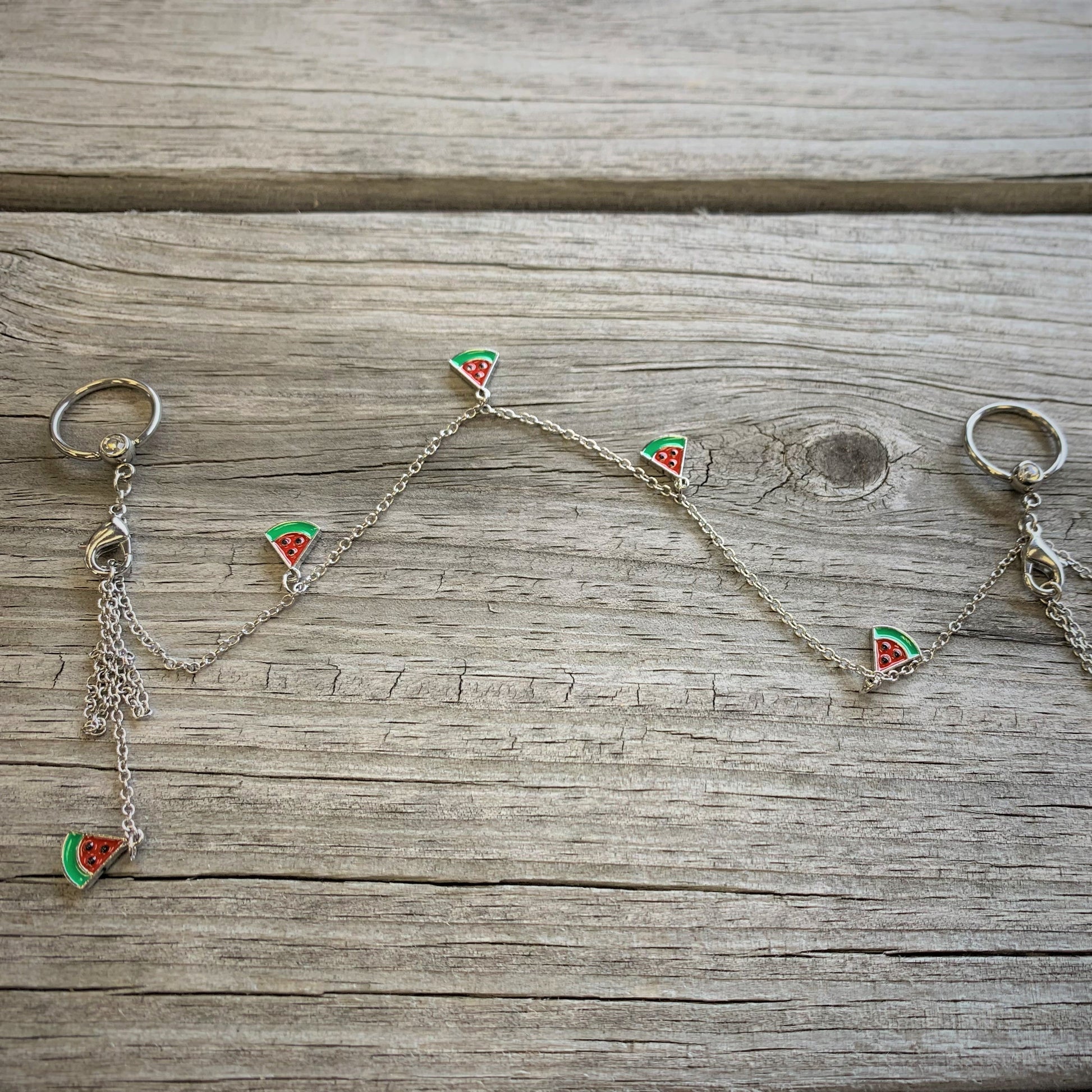 Mmmm....the little watermelon slices dangling from this nipple chain jewelry look so sweet you'll want to keep them all to yourself! This 14 gauge nipple jewelry is made with 14mm durable 316L surgical grade stainless steel circular rings. The rings have 5mm captive beads set with clear gems. Hanging between the rings is a 14" length of chain that supports sweet little green and red watermelon charms, complete with little black seeds. This nipple jewelry is sure to make your piercings look delicious!Specifications