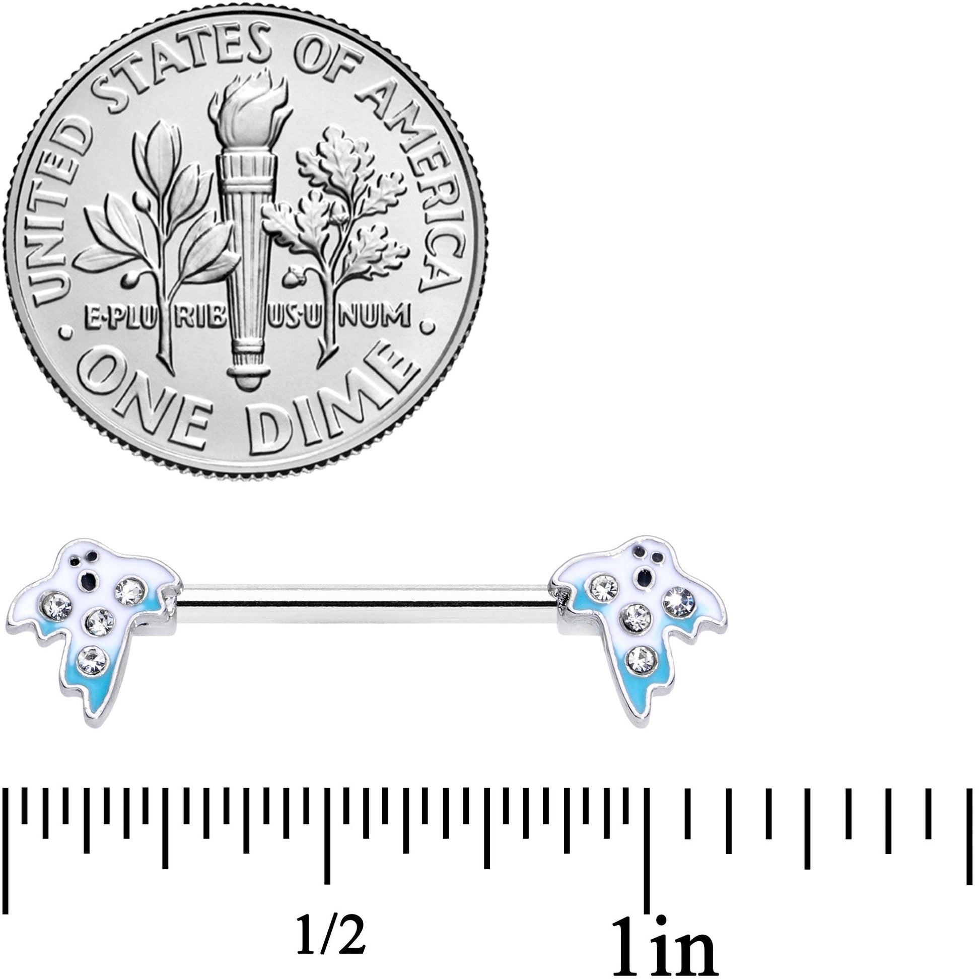 This pair of 14 gauge nipple jewelry is absolutely booo-tiful! It's made with 14mm durable 316L surgical grade stainless steel straight barbells. The ends feature white ghost charms set with several small clear gems to add visual interest. The ghost ends are further embellished with pale blue detailing along the edges to add contrast and further visual impact. Even after Halloween has been laid to rest, you'll love having these ghosts haunt your nipple piercings! Sold as a set of two.Specifications