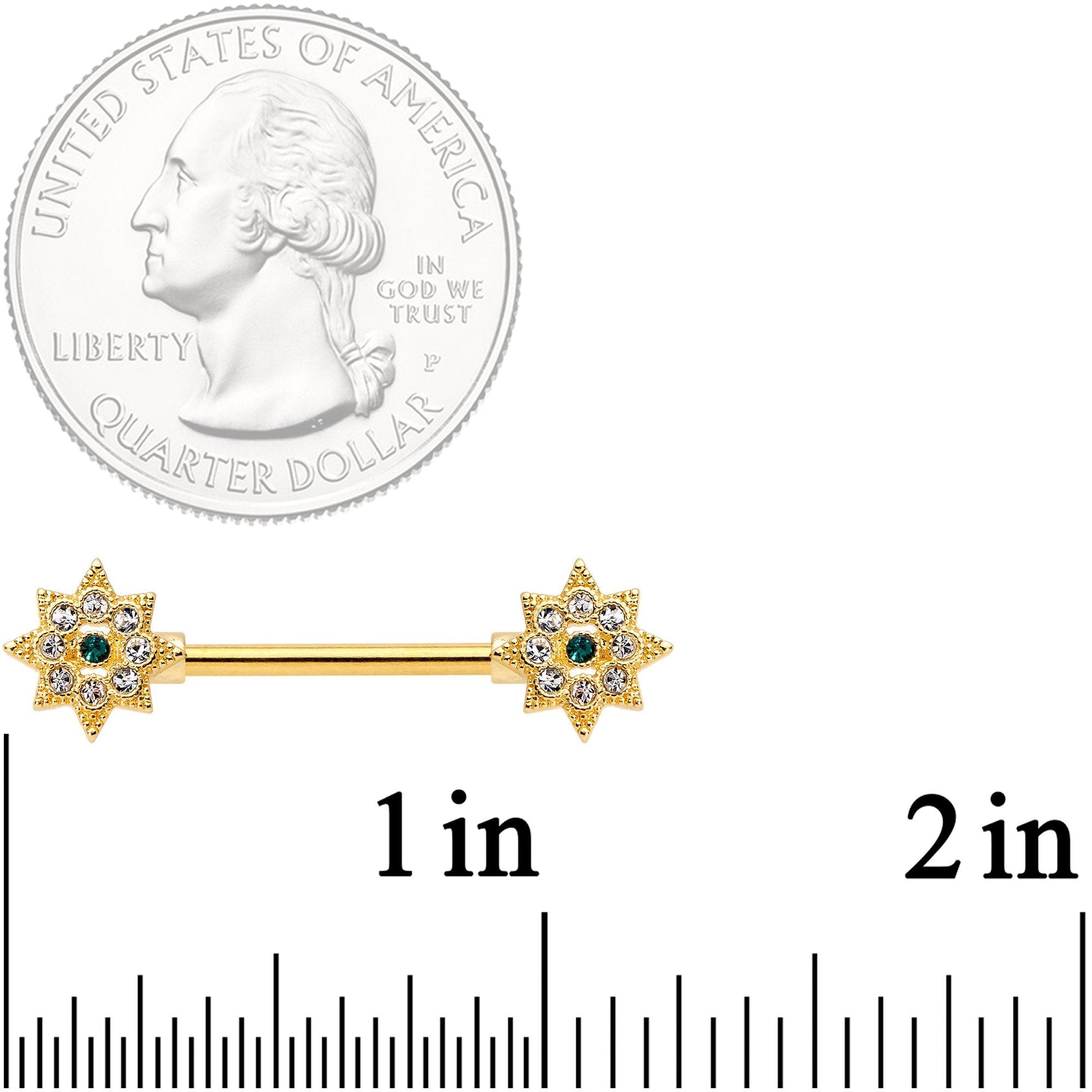 If you want to feel like you're seeing stars whenever you put in your nipple jewelry then you will love this pair of 14 gauge nipple piercings. Made with 14mm gold tone PVD over 316L surgical grade stainless steel straight barbells, these nipple barbells feature starburst inspired charm ends with clear and green cubic zirconia gems for a unique look. Sold as a set of two.Specifications