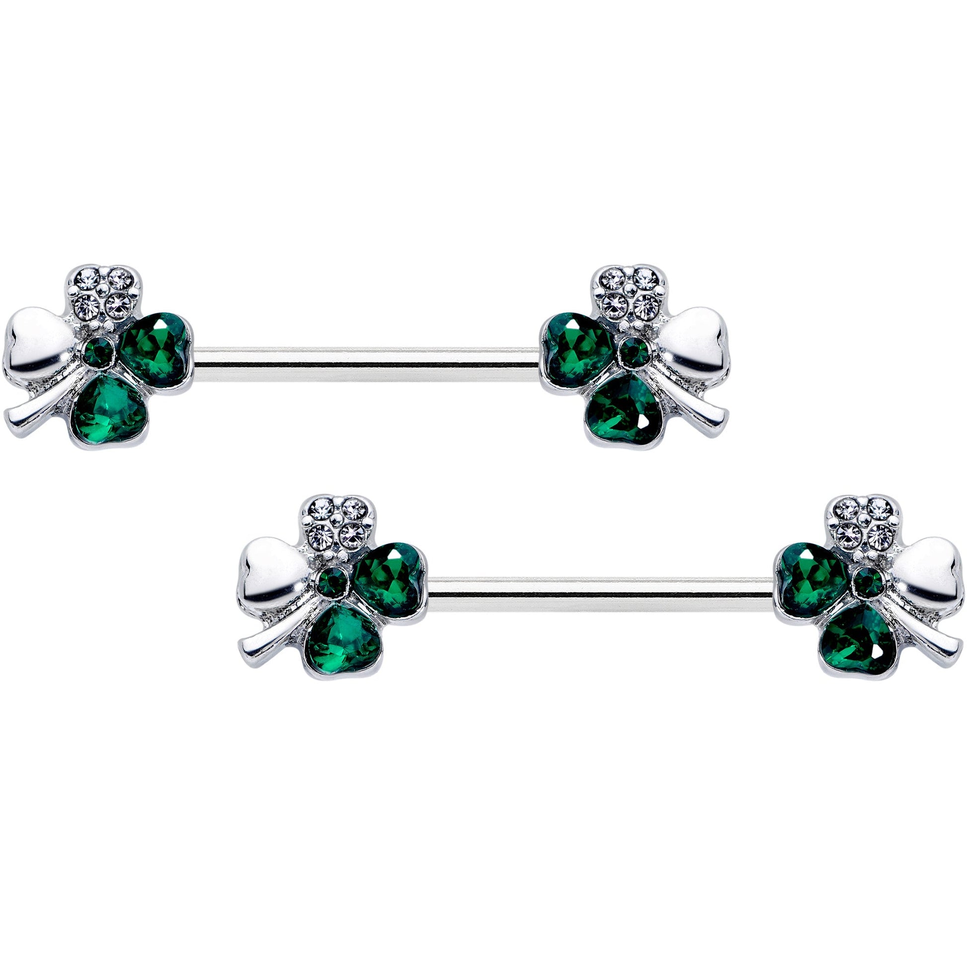 If you really really love Saint Patrick's Day, this 14 gauge nipple jewelry was designed with you in mind! It's made with 14mm durable 316L surgical grade stainless steel straight barbells. Each of the ends features a green shamrock charm with two of the leaves composed of large, individual green gems. Another leaf is paved in tiny clear gems. The shamrocks also features a small green gem at the center to give them a cohesive look. Show the world that you keep Saint Patrick's Day in your heart all year long with this beautiful nipple piercing jewelry! Sold as a set of two.Specifications