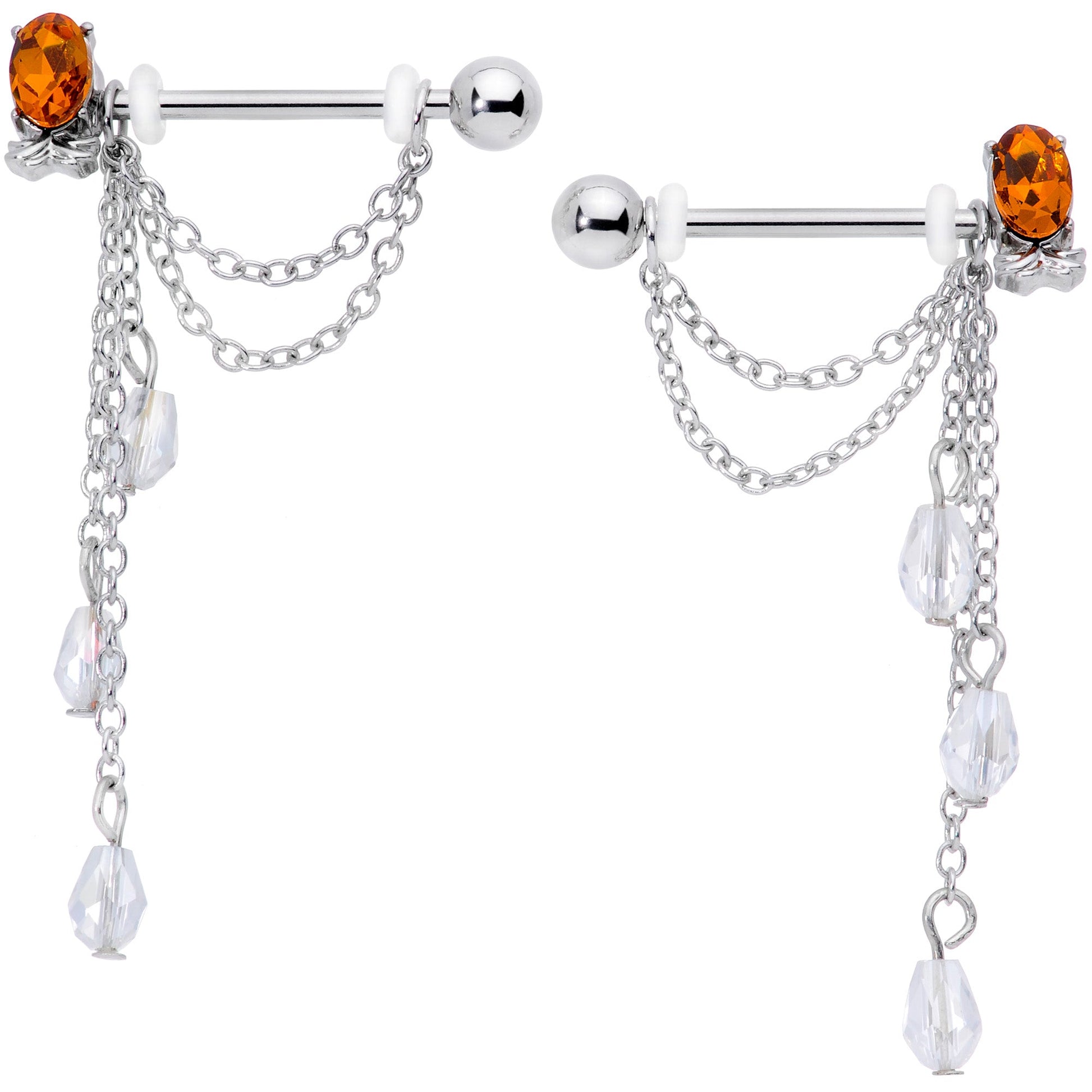 14G 9/16 Clear Orange Gem Pineapple Dangle Nipple Ring Set
