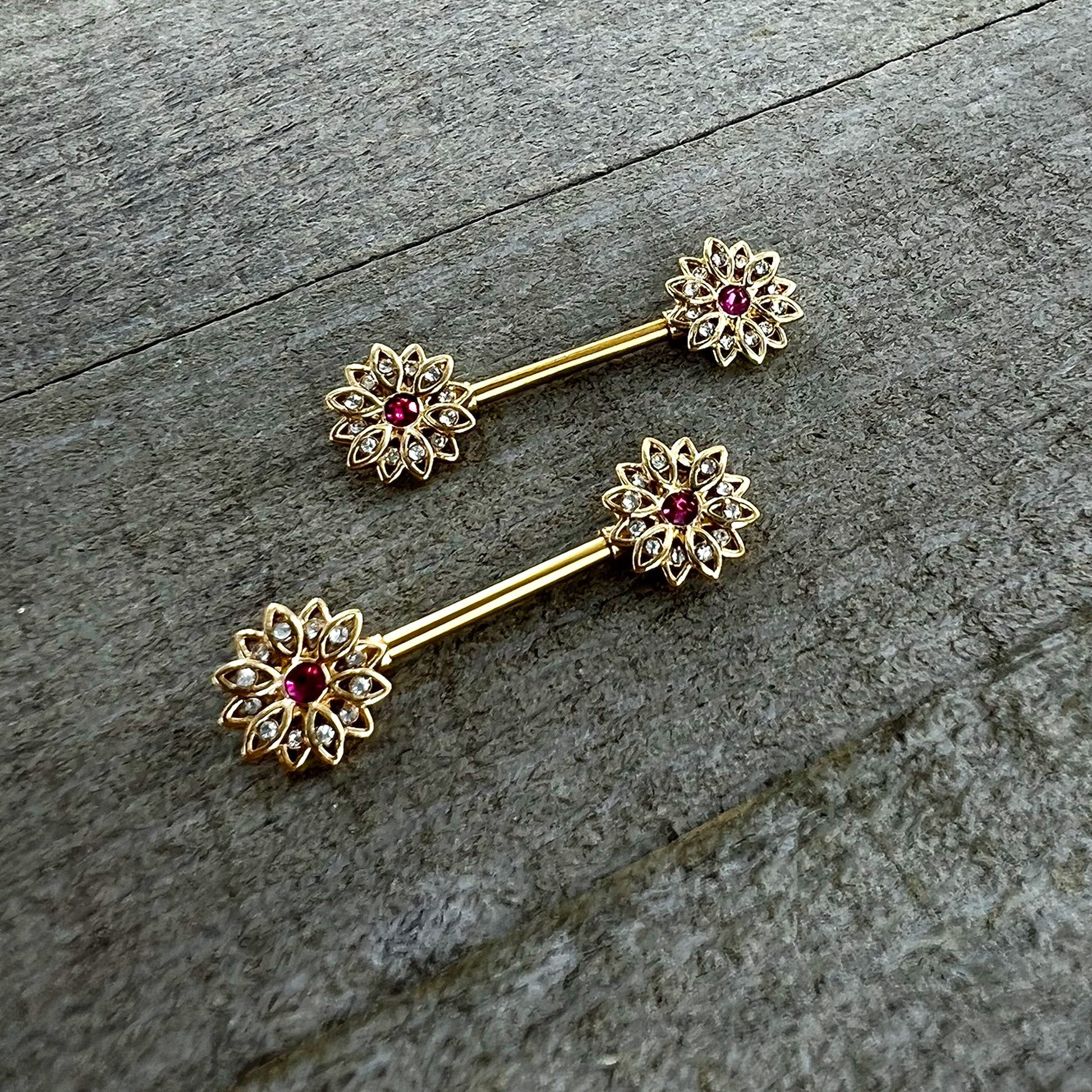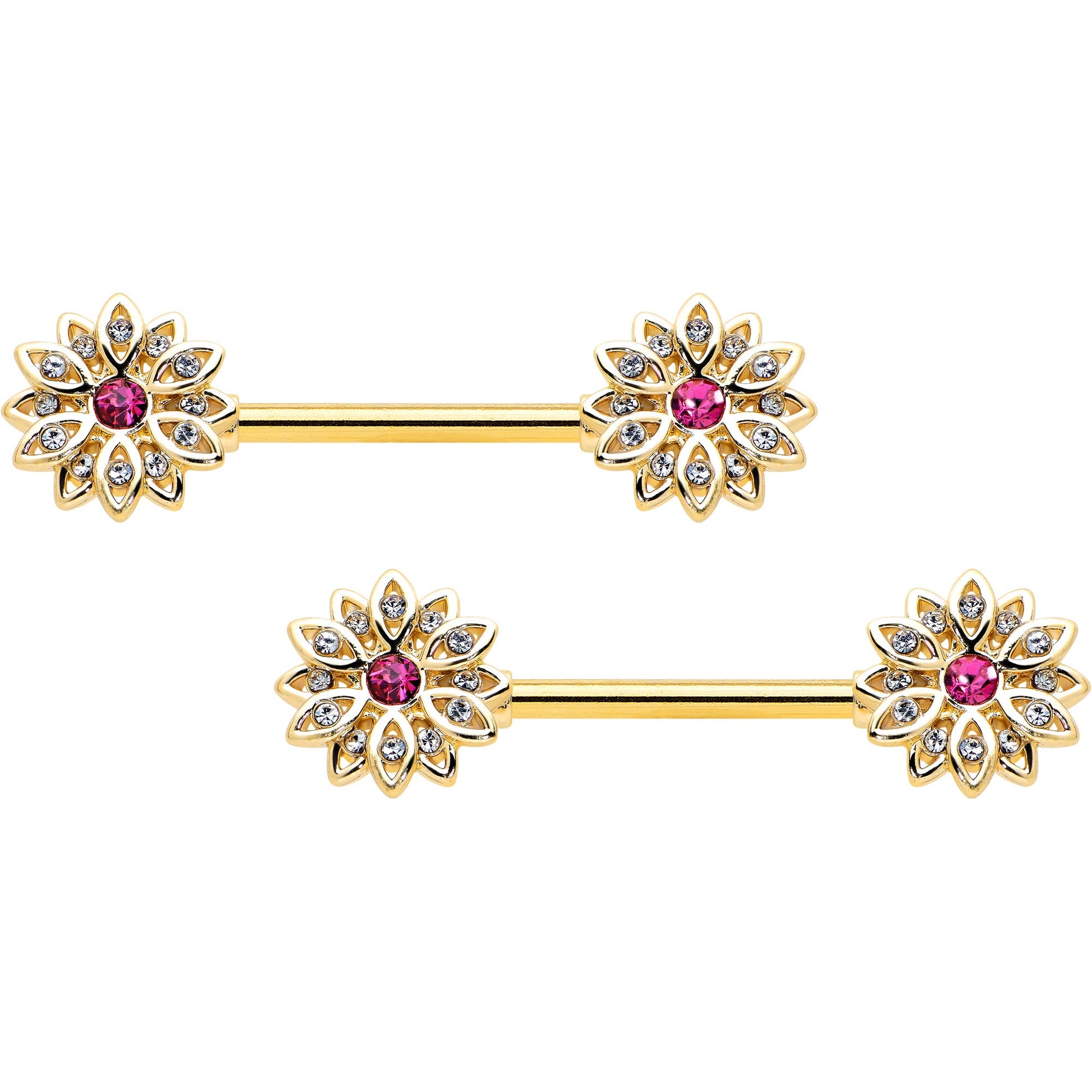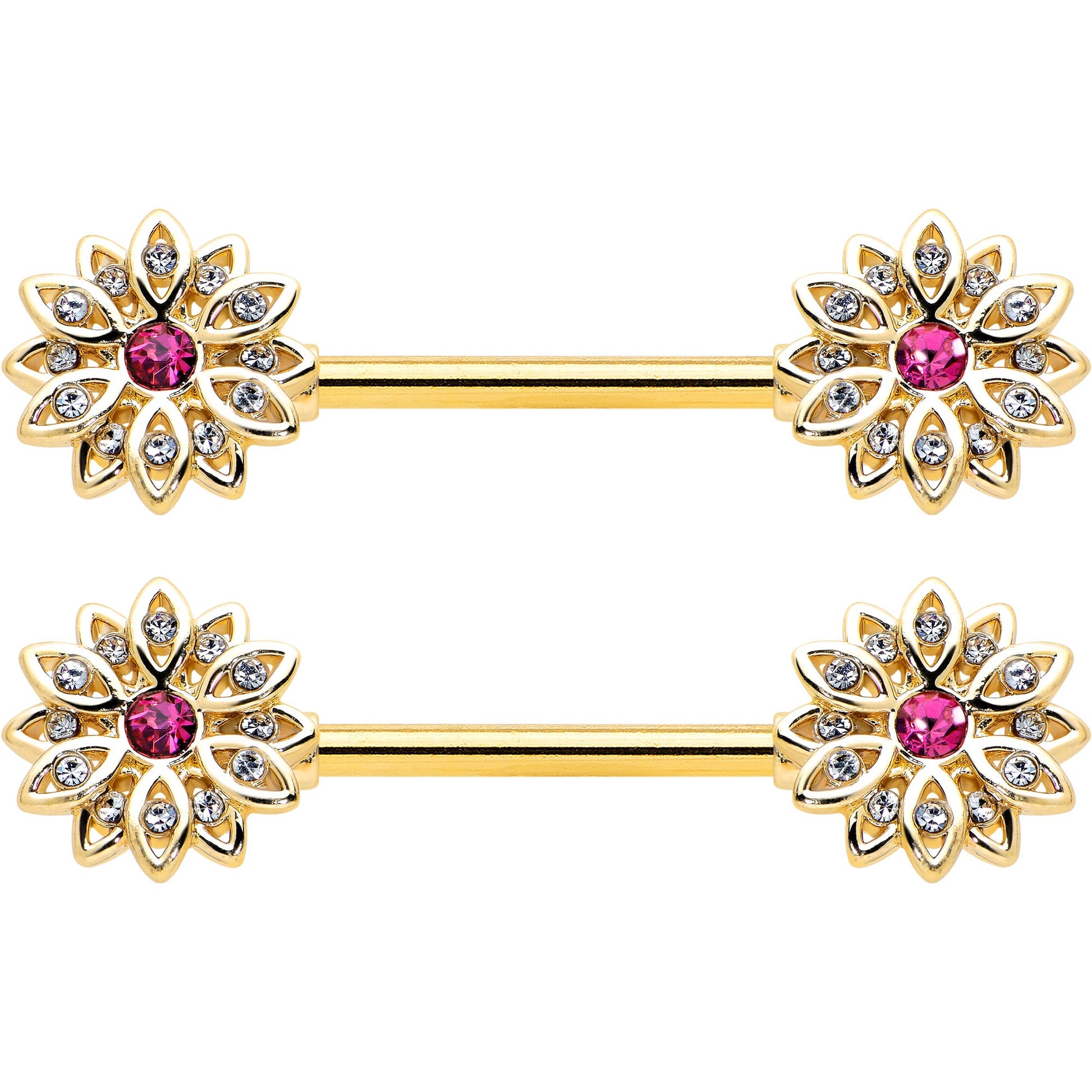 Some flowers are meant to be stars, like this 14 gauge nipple jewelry! It's made with 14mm gold tone PVD over 316L surgical grade stainless steel straight barbells. Each of the ends features a detailed flower charm, with petals paved with clear gems and the flower is set at the center with a pink gem for stunning color contrast. Let your piercings bloom like the stars they are when you're rocking these striking starry flower nipple piercing rings. Sold as a set of two.Specifications