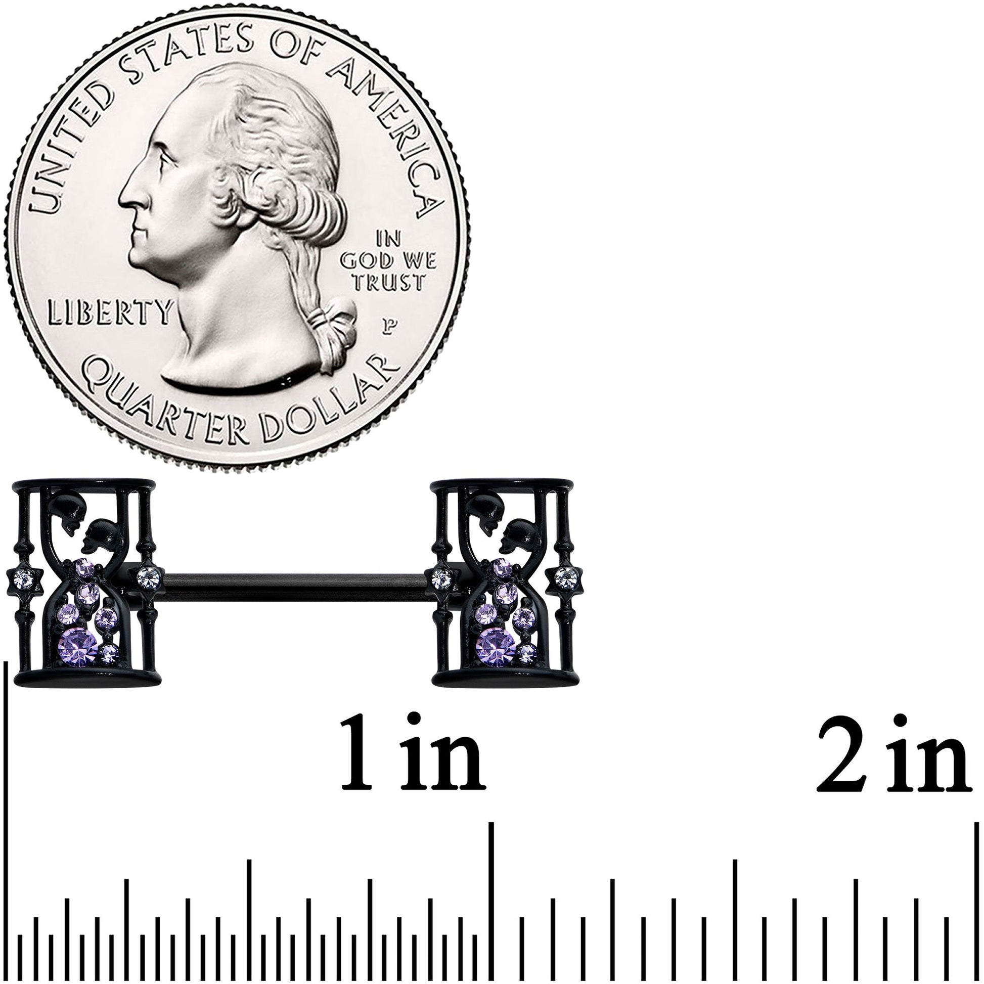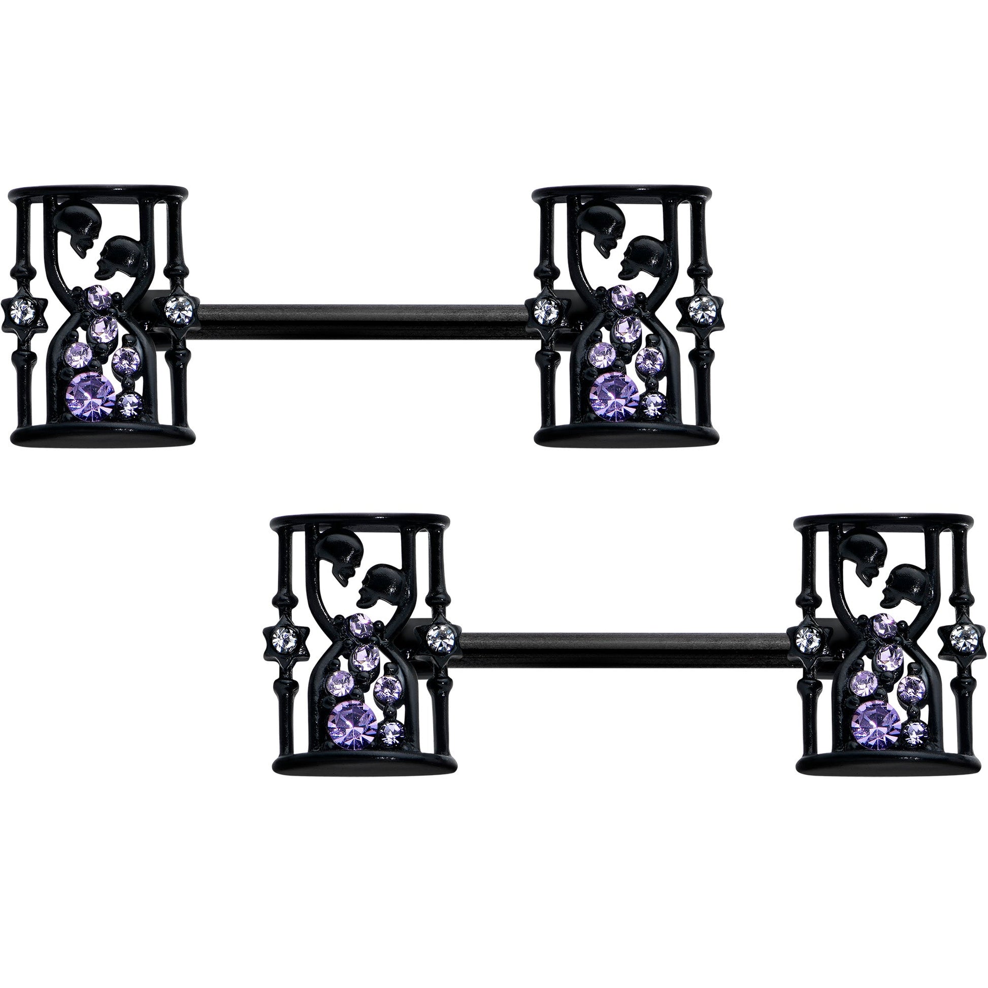 It's time....to add some dark elegance to your look with this 14 gauge nipple jewelry! It's made with 14mm black PVD over 316L surgical grade stainless steel straight barbells. Each of the ends features an hourglass charm, with purple gems for the sand. They're embellished with two black skulls one on each side.The hourglasses are also embellished with a pair of stars with clear gem centers. You'll want these gothic beauties in your nipple piercings all the time! Sold as a set of two.Specifications