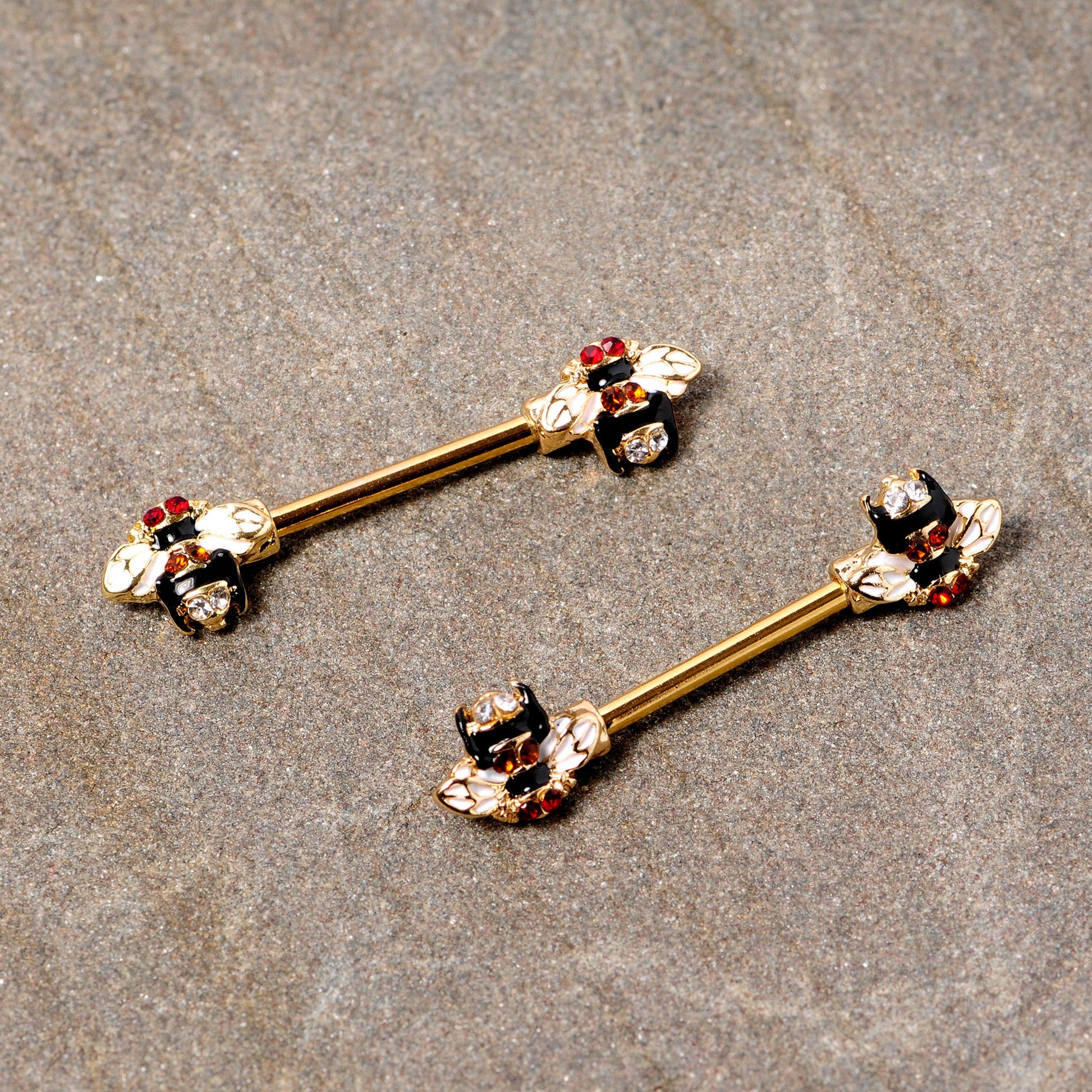 These are bees that are living in the lap of luxury! These 14 gauge nipple rings are made with gold tone anodized over 316L surgical grade stainless steel straight barbells. The ends feature black and white bee charms with red gems for eyes. They have bodies set with bands of clear gems, and deep golden yellow gems. The overall look is extremely decadent and utterly luxurious. This bee nipple jewelry is bound to give your look a buzz! Sold as a set of two.Specifications