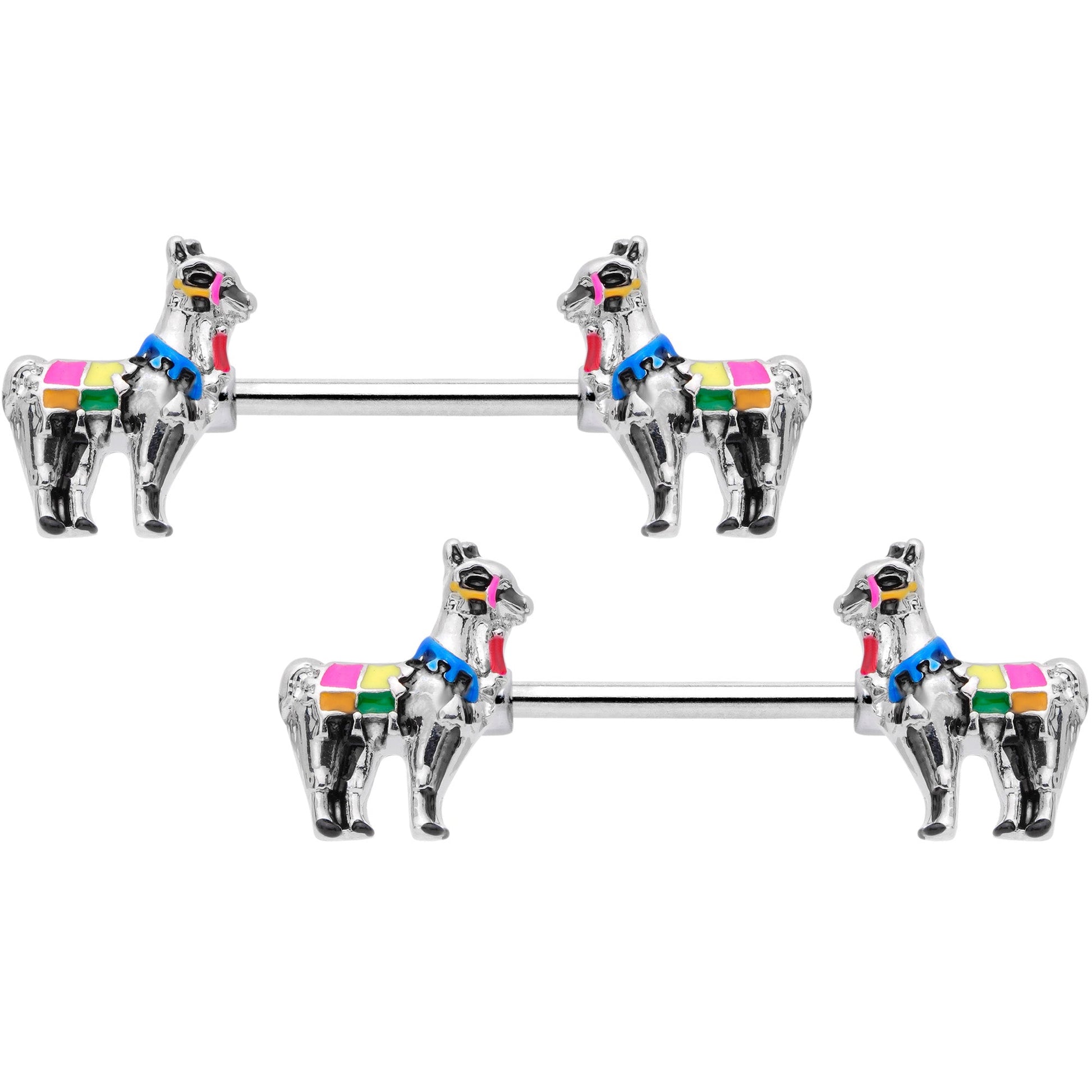 This llama might be a drama llama but in the best possible way! This 14 gauge nipple jewelry is made with 14mm durable 316L surgical grade stainless steel straight barbells. The ends feature llama charms in bright tones to delineate its blanket, harness, bridle, and eye. Now that's the kind of drama we love.....and you won't have to travel to Lake Titicaca to have llamas in your nipple piercings! Sold as a set of two.Specifications