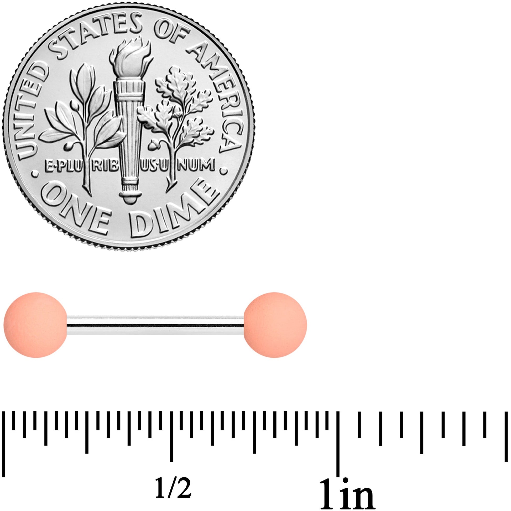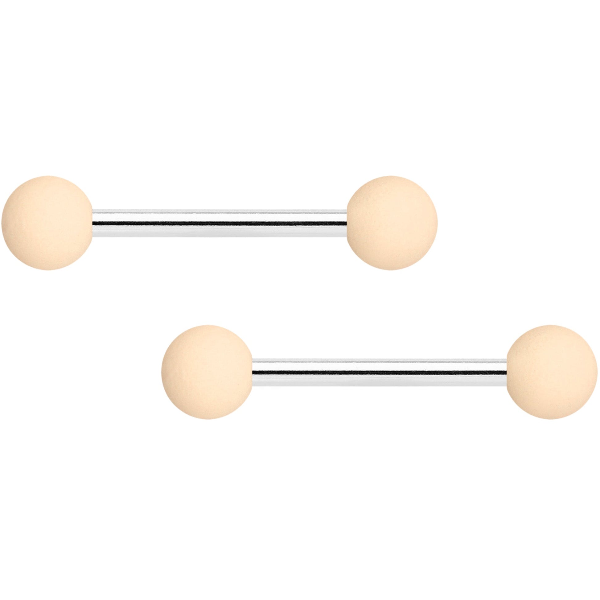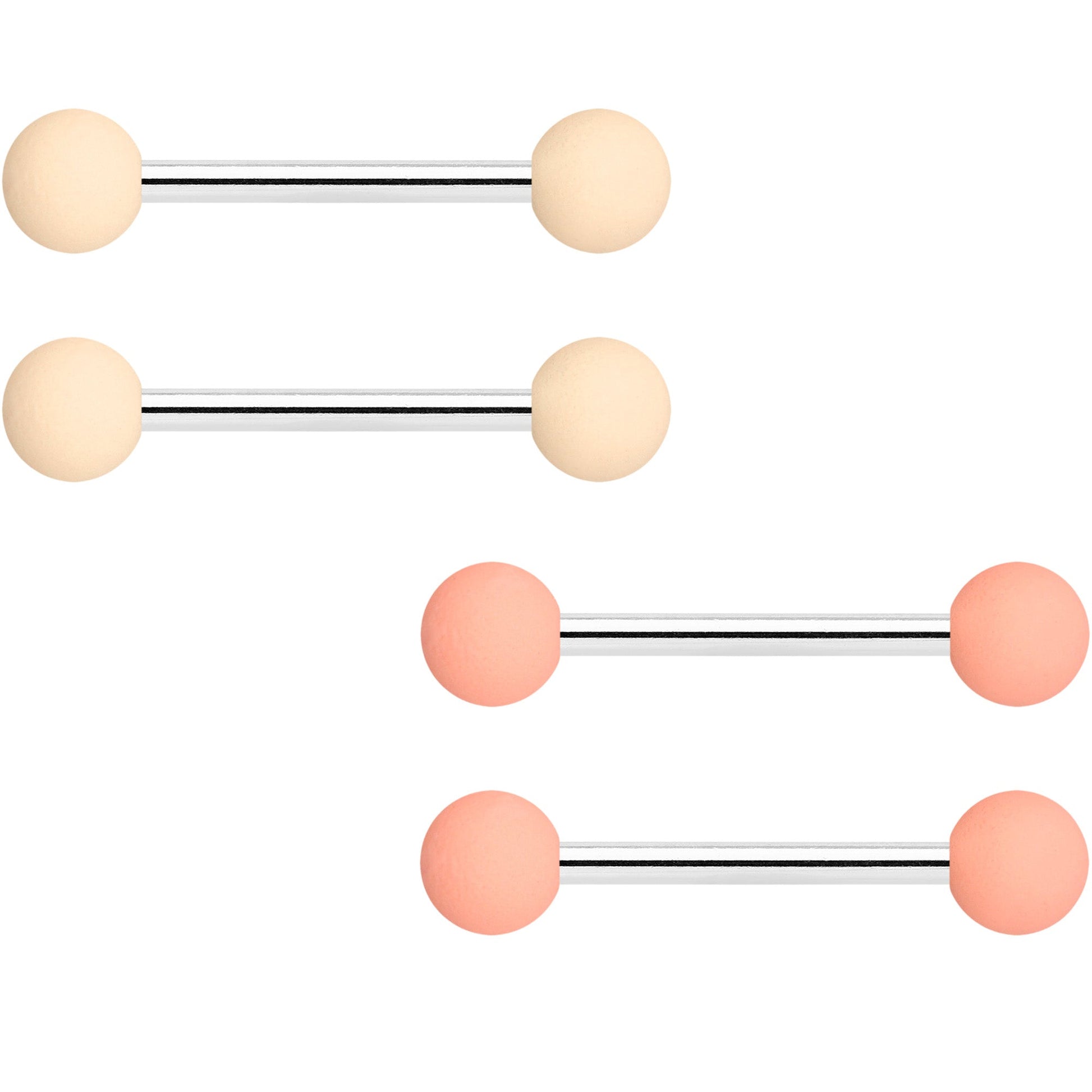 Simple style and peachy-keen color combine to make comfortable and dainty nipple jewelry with these 14 gauge nipple rings! They're made with 14mm durable 316L surgical grade stainless steel straight barbells with 5mm ball ends. One pair has perfectly peach color ends while the other pair is elegantly classic cream, and both have a subtly soft, matte finish to them. Keep it simple while still keeping it stylish with these punchy, peachy keen nipple rings! Sold as a set of four.Specifications
