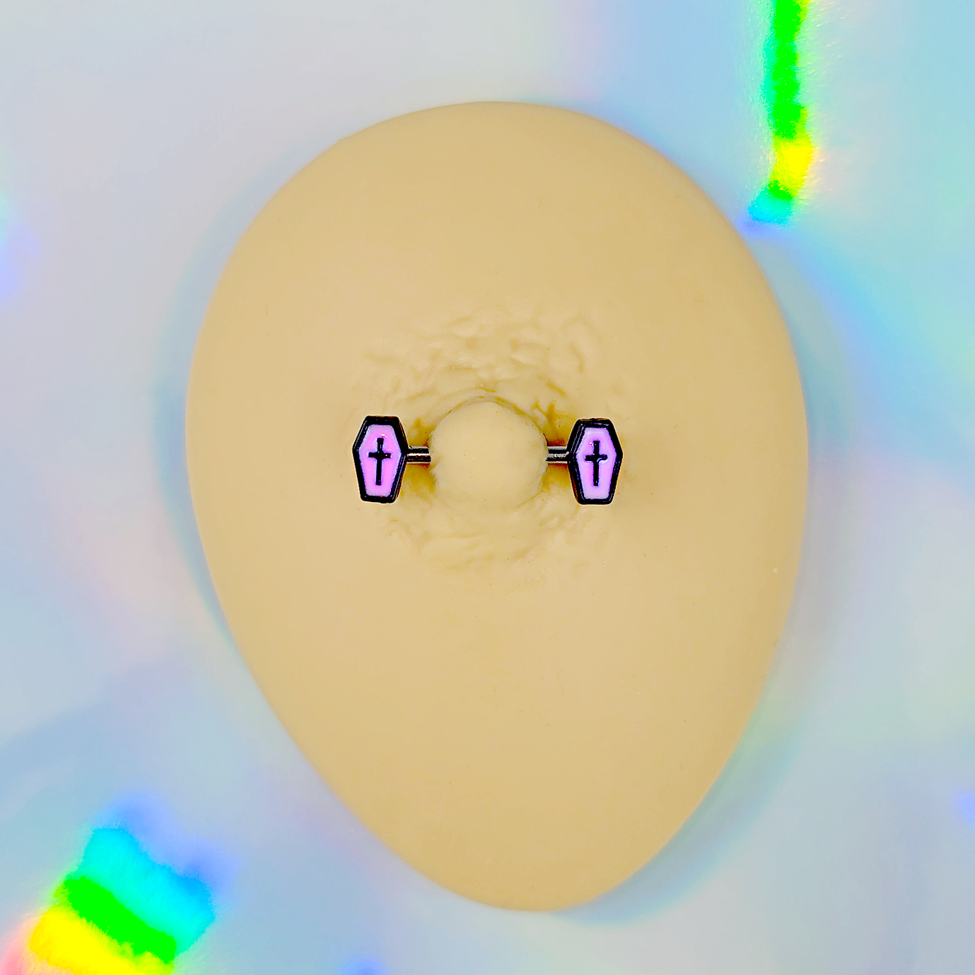 Bring your nipple piercings back from the dead this Halloween with this 14 gauge nipple jewelry! It's made with 14mm durable 316L surgical grade stainless steel straight barbells. Each of the ends features a light purple casket charm, with black detailing and cross embellishments. The coffins glow when the lights go out for a creepy cute look you'll love! You'll be glowing with joy when you're rocking these spooky coffin nipple piercing rings! Sold as a set of two.Specifications