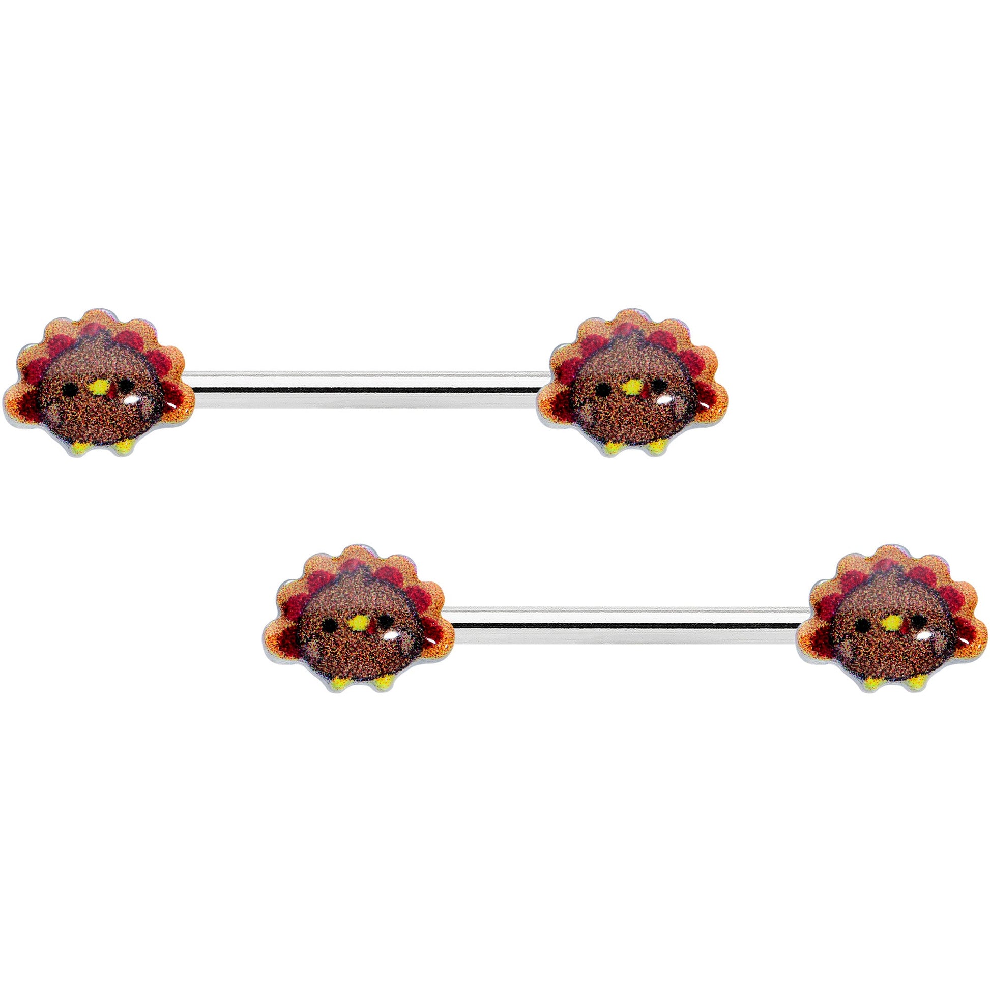 These are some turkeys you won't want to eat, when you're rocking this 14 gauge nipple jewelry! It's made with 14mm durable 316L surgical grade stainless steel straight barbells. Each of the ends features a kawaii-inspired turkey charm, inlaid in brown and sporting Fall colors on their tails. Add a little turkey to your look during the cold days of fall with these charming Thanksgiving turkey nipple piercing rings! Sold as a set of two.Specifications