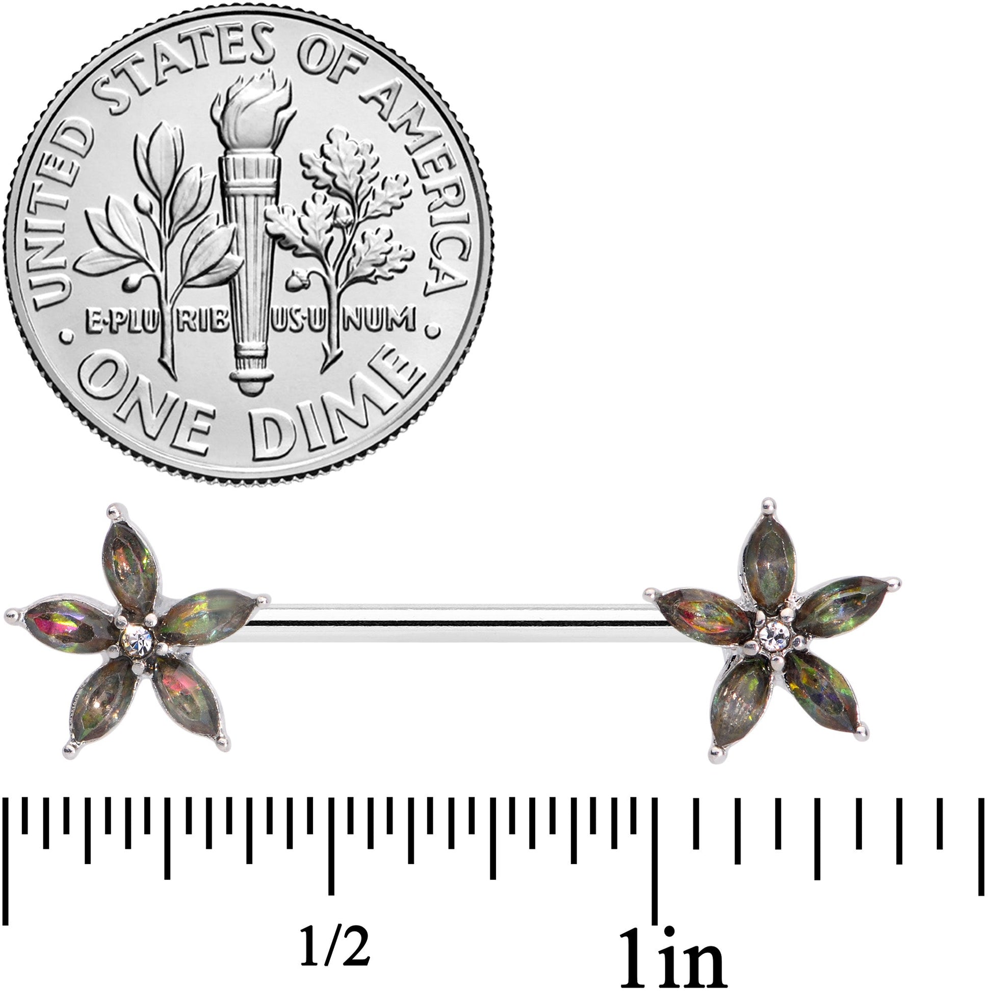 The flowers on this 14 gauge nipple jewelry will make your nipple piercings into stars! They're made with 14mm durable 316L surgical grade stainless steel straight barbells. Each of the ends is a flower charm with cats-eye shaped petals that are reminiscent of a star's rays, and each petal is a single gem in a mysterious and striking dark aurora color. There's even a clear gem at each flower's center for an elegant and whimsical appearance. This elegant flower nipple jewelry will have you seeing stars! Sold as a set of two.Specifications