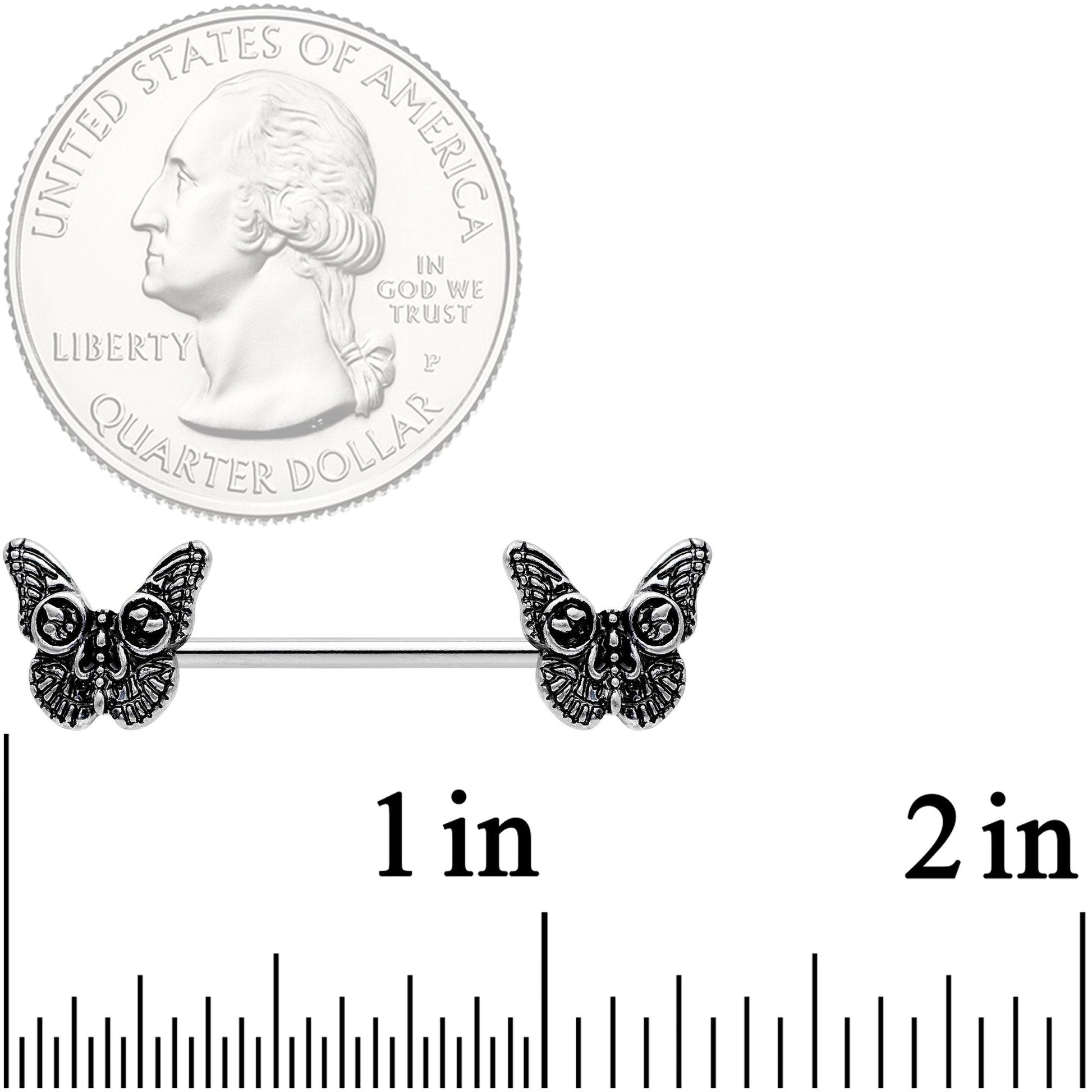 Butterflies seem to be so innocent and harmless, but these are butterflies with a grim secret. These 14 gauge nipple piercings are made with 14mm durable 316L surgical grade stainless steel straight barbells. Each end is a is a butterfly which at first glance appears to be a beautifully detailed but innocent specimen that you might see flitting across the flowers on a sunny day. But on closer inspection, you'll notice that the embellishments and the bottom wings come together to form the grinning face of a skeleton. Not so innocent after all! If you have a secret love of the macabre that you'd like to celebrate, let this butterfly nipple jewelry bring out your spooky side! Sold as a set of two.Specifications