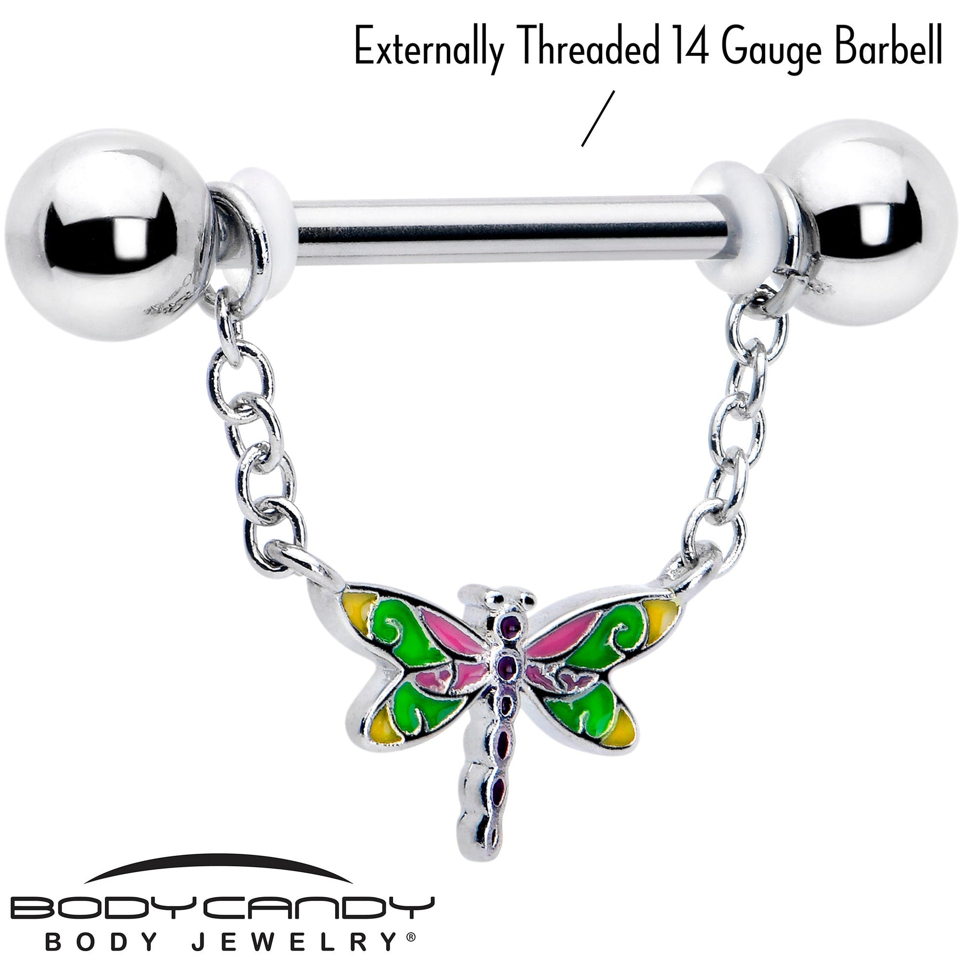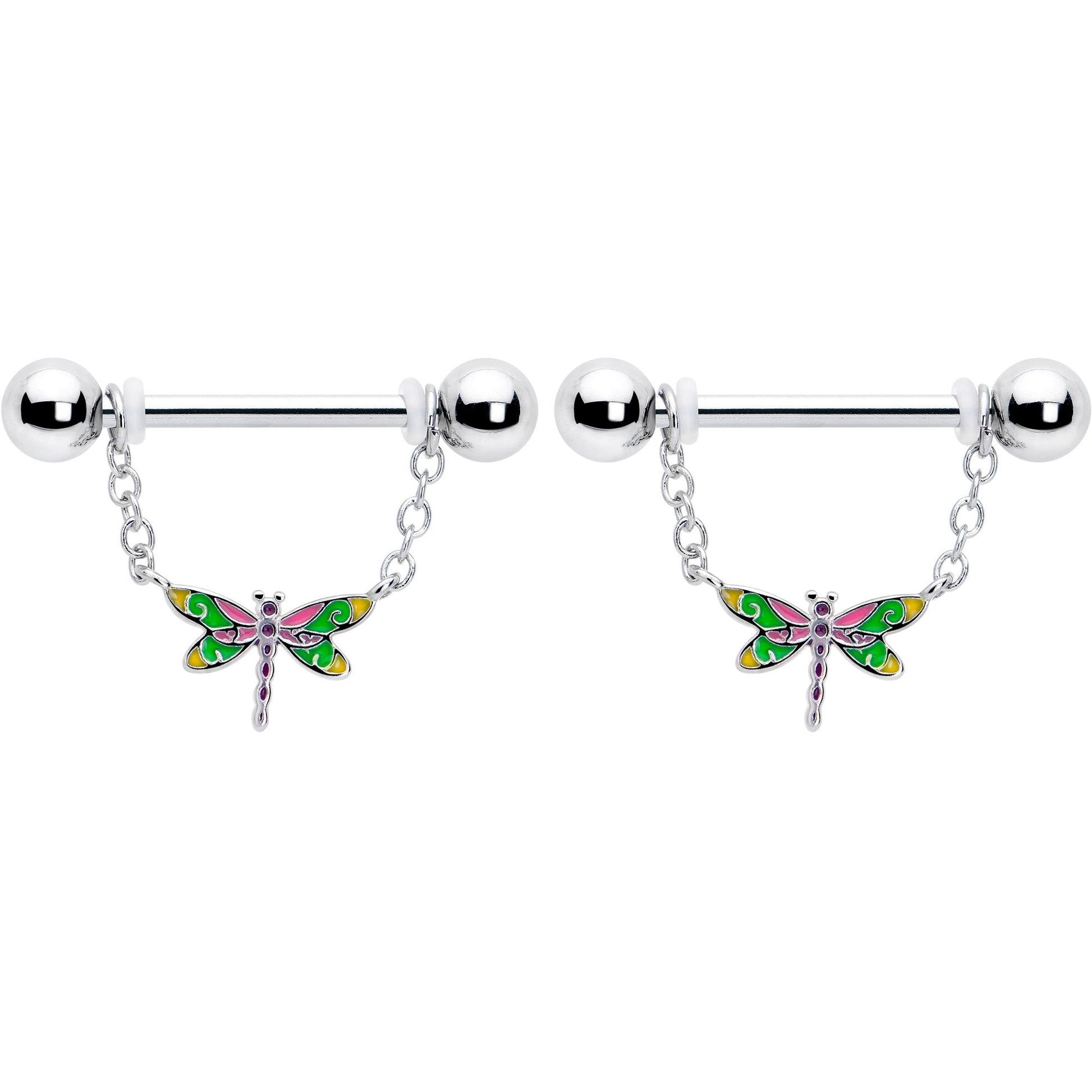 Let your look soar with style when you're rocking this 14 gauge nipple jewelry. It's made with 14mm durable 316L surgical grade stainless steel straight barbells with 5mm ball ends. Each barbell features a double length of matching chain. The chains each support a dangle dragonfly charm, inlaid with green, yellow, pink and purple for a colorful look you can't miss. Spread your wings and take flight with these colorful dragonfly nipple piercing rings. Sold as a set of two.Specifications