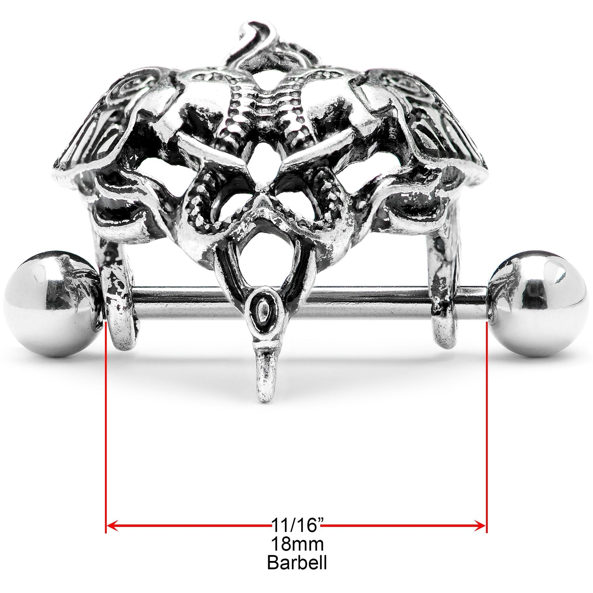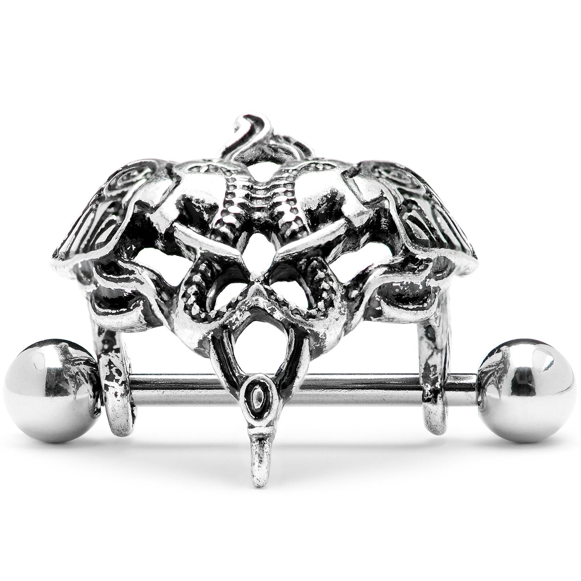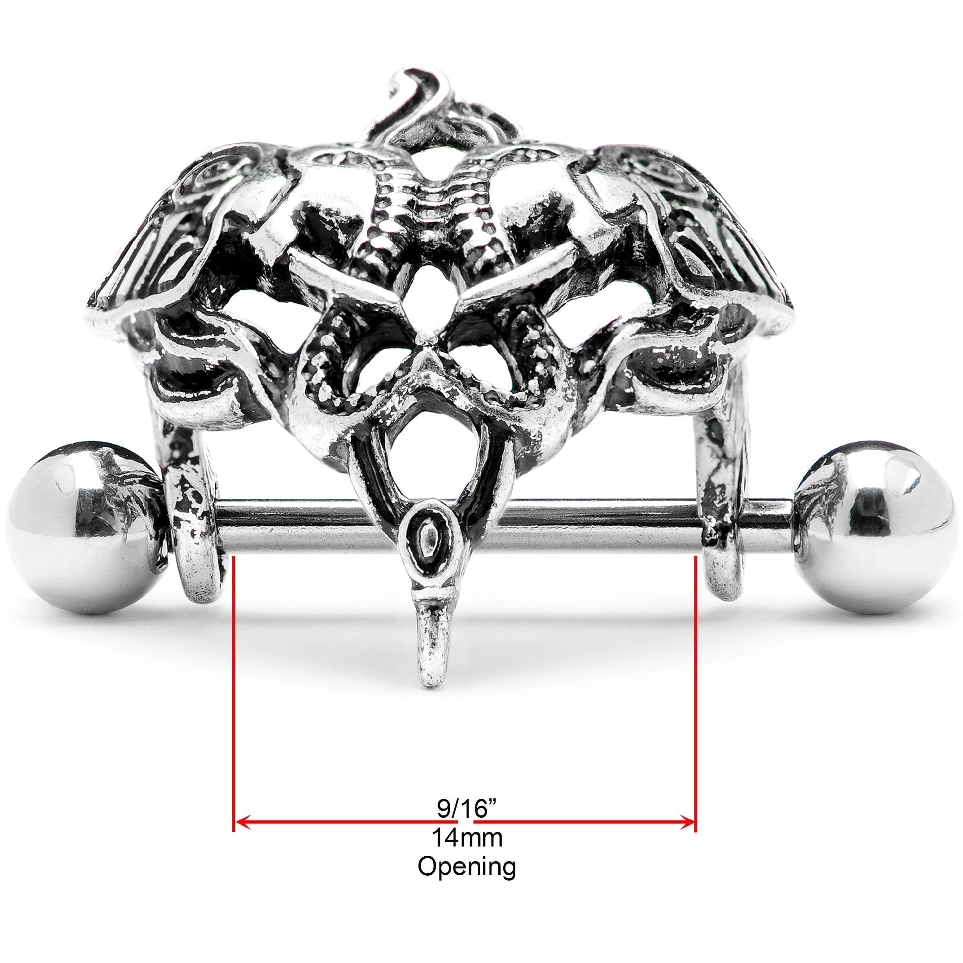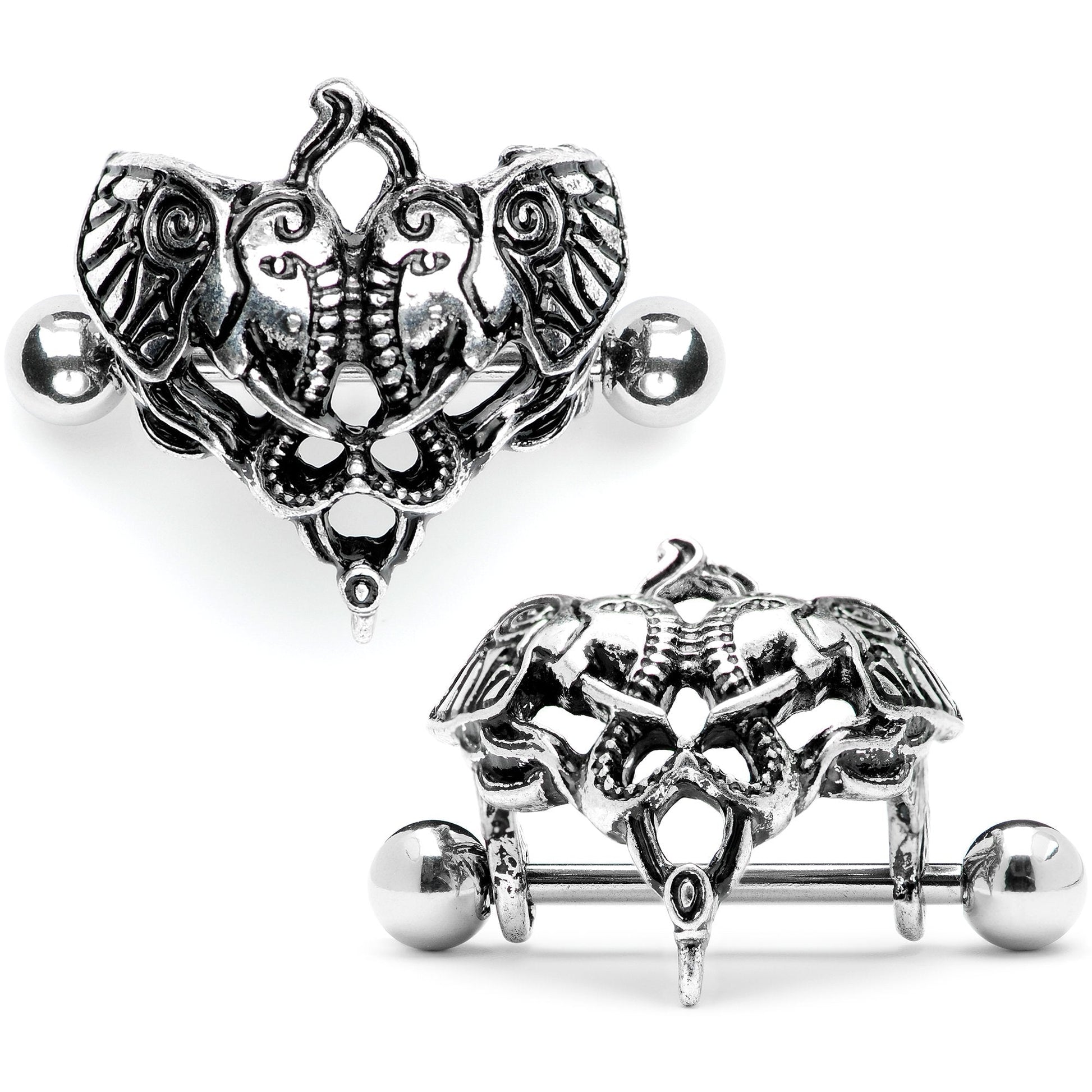 Are these elephants preparing for battle or just gazing lovingly into one another's eyes? These 14 gauge nipple piercings feature two ornately decorated elephant faces looking at each other across 14mm durable 316L surgical grade stainless steel straight barbells. Each shield has a width of 9mm and a rise of 13mm for a perfect fit. Perhaps the elephants are simply admiring how gorgeous they are and once you see them, you will too. Sold as a pair.Specifications