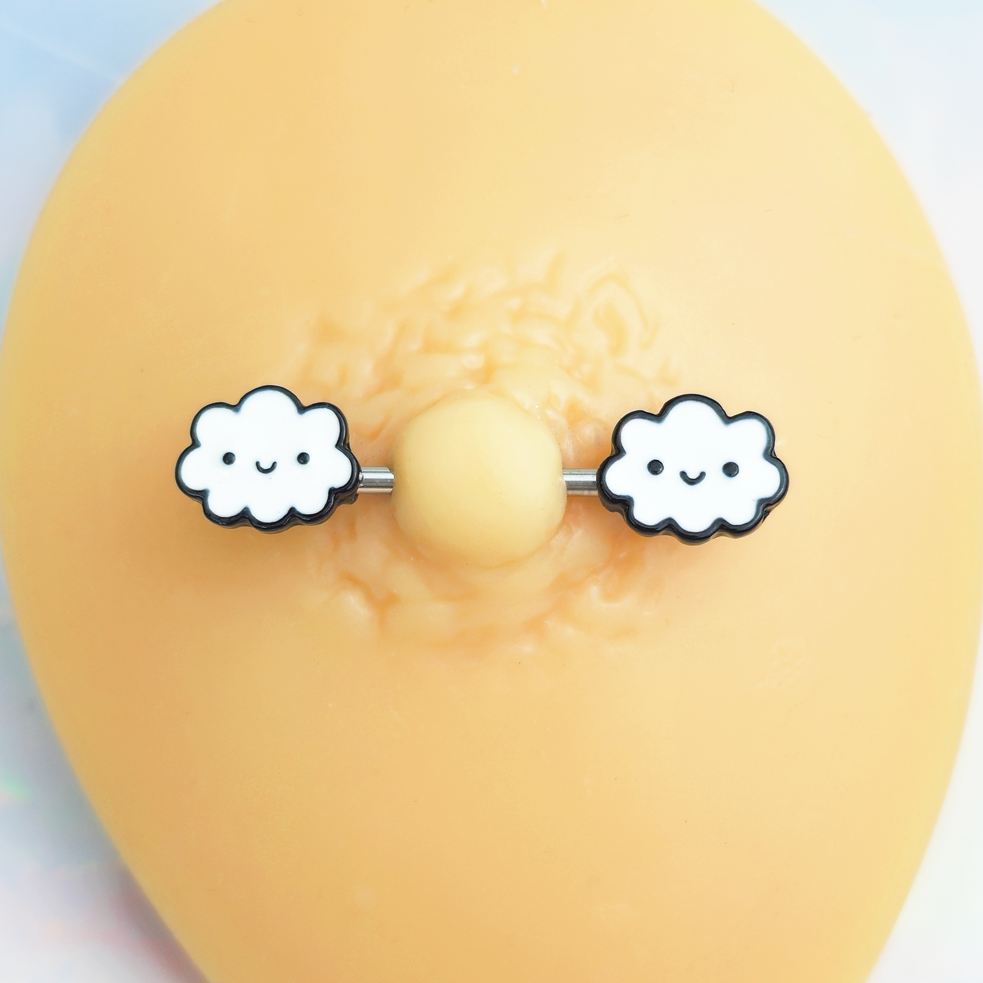 If you're always looking for the rainbow after the rain then you will love this pretty 14 gauge pair of nipple barbells. Made with 14mm durable 316L surgical grade stainless steel straight barbells, this nipple jewelry set features happy fluffy white cloud ends that will remind you that a couple of clouds don't mean a rainy day! This pair of cloud nipple piercings is sold as a set of two for you.