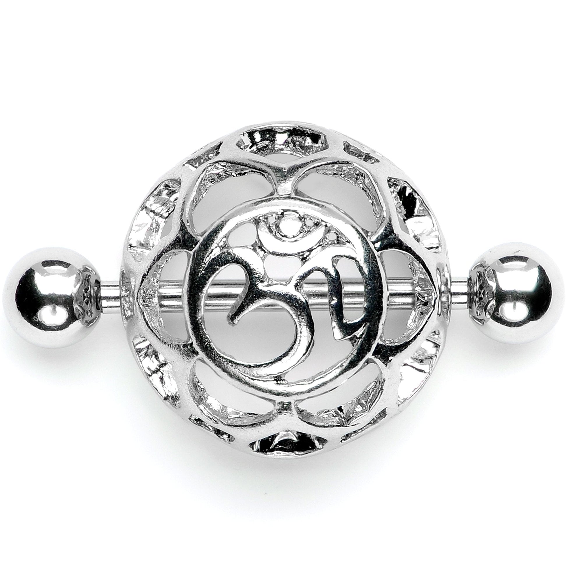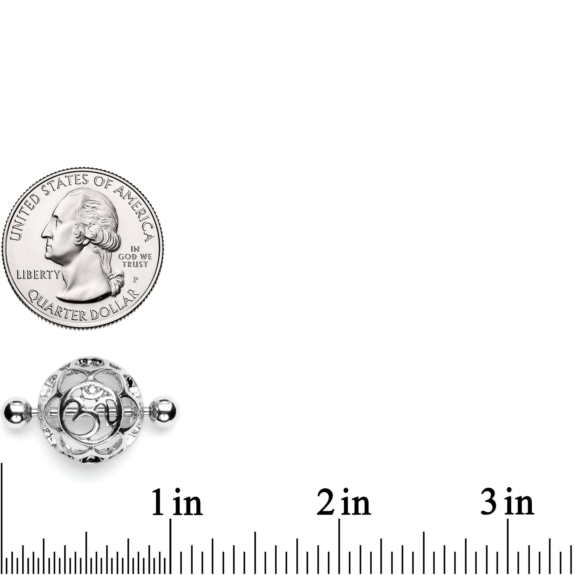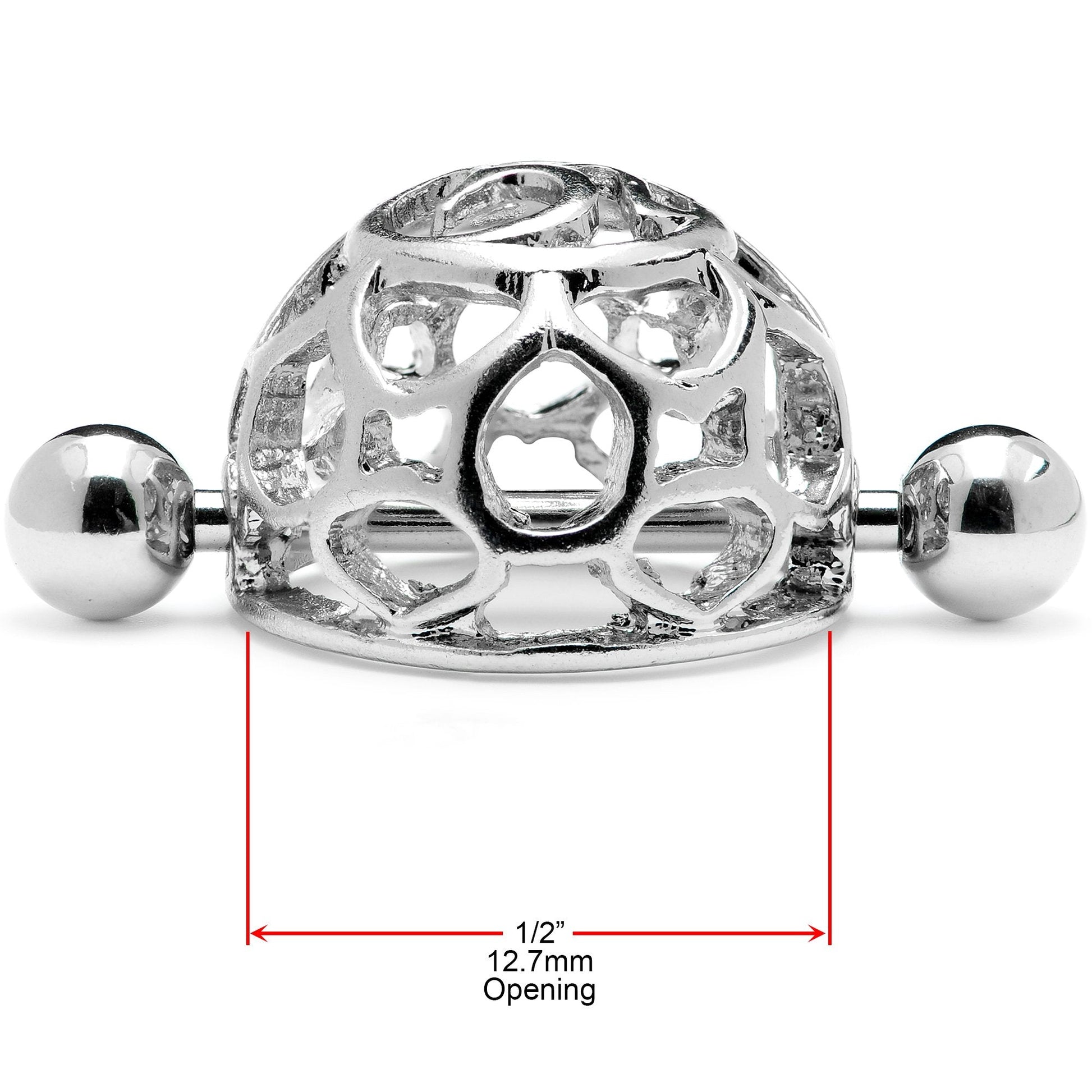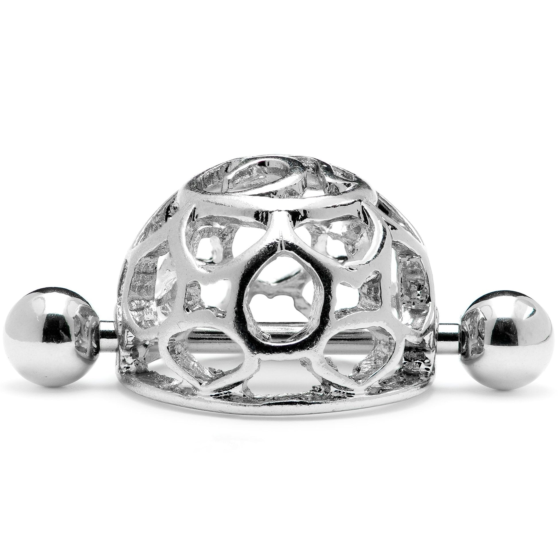 When all the parts work together, the final product can be something amazing! And that's exactly what's happening with these 14 gauge nipple piercings. Made with 14mm durable 316L surgical grade stainless steel straight barbells, they feature dome-shaped shield charms comprised of varying framework geometric shapes. The contrast between the different parts make for a stunning final piece and with a 10mm width and rise of 8mm, they're comfortable as well as gorgeous. Sold as a pair.Specifications