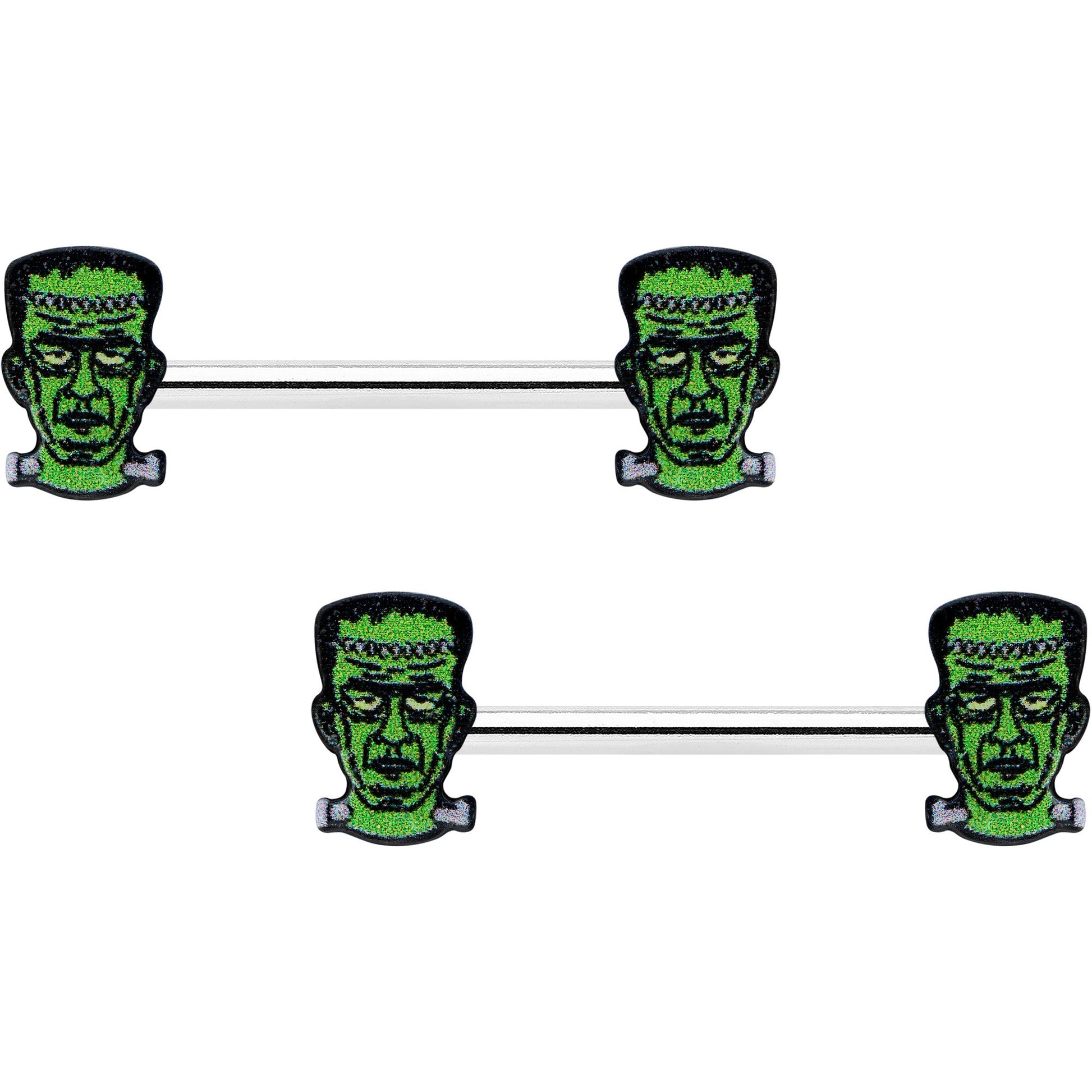 It's alive....or it certainly looks lifelike on this 14 gauge nipple jewelry! It's made with 14mm durable 316L surgical grade stainless steel straight barbells. Each of the ends features a Frankenstein's monster charm, from the neck up. The monster's heads are green and feature a realistically expressionless expression. They glows in the dark when the lights go down for a perfect Halloween look. Grab your pitchforks and torches, Frankenstein's monster is loose when you're rocking these wonderfully horrifying nipple piercing rings! Sold as a set of two.Specifications