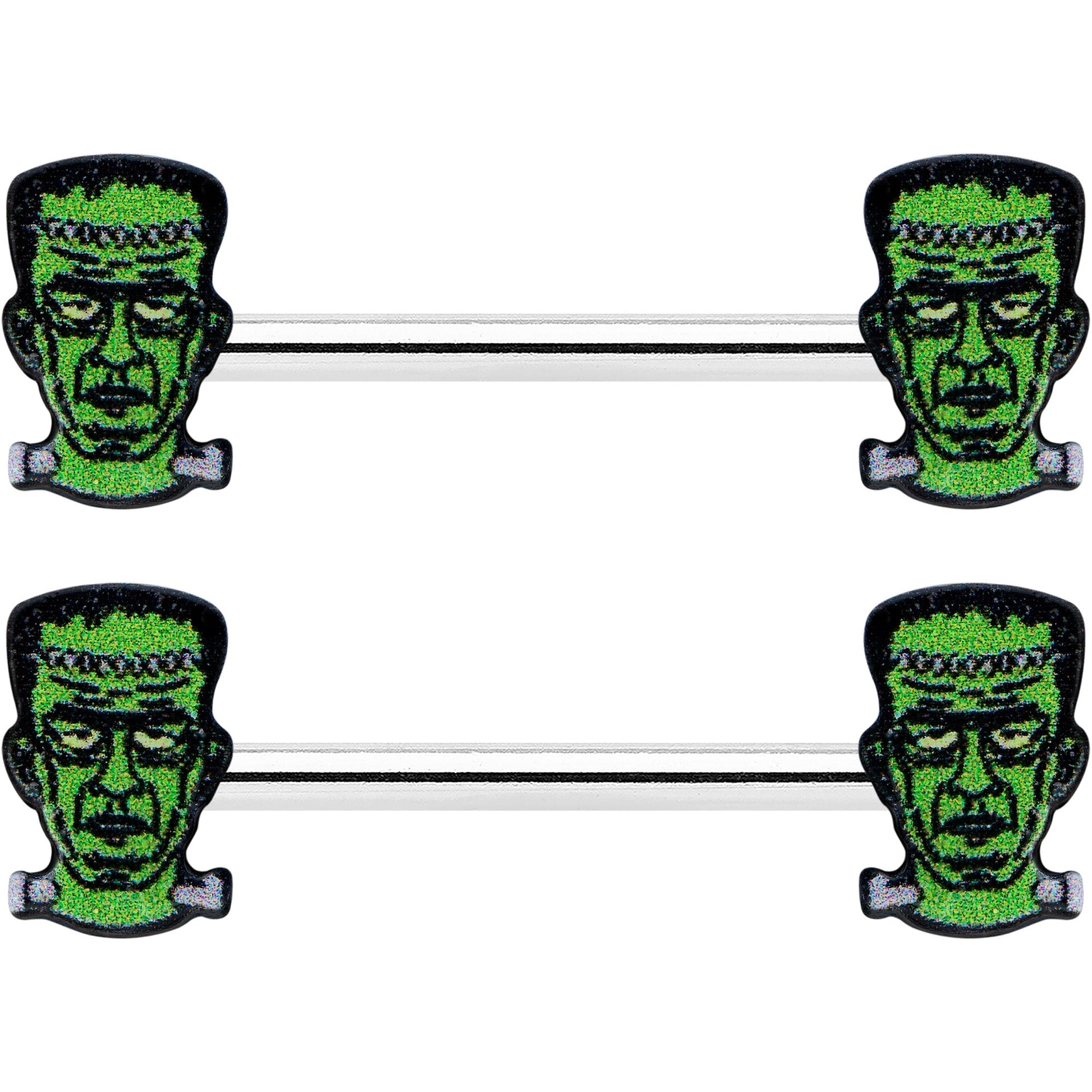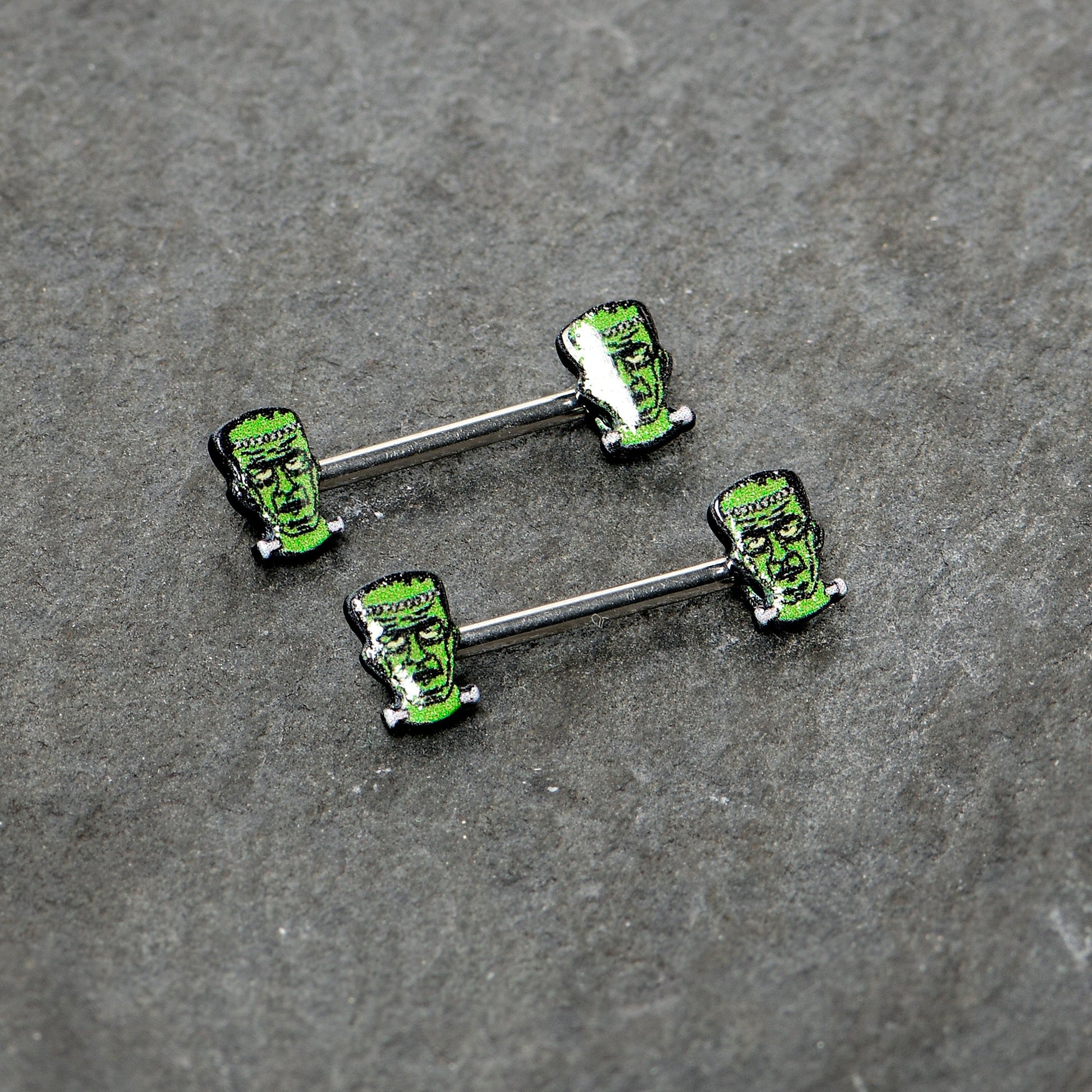 14G 9/16 Frankenstein Head Green Glow in the Dark Nipple Ring Set