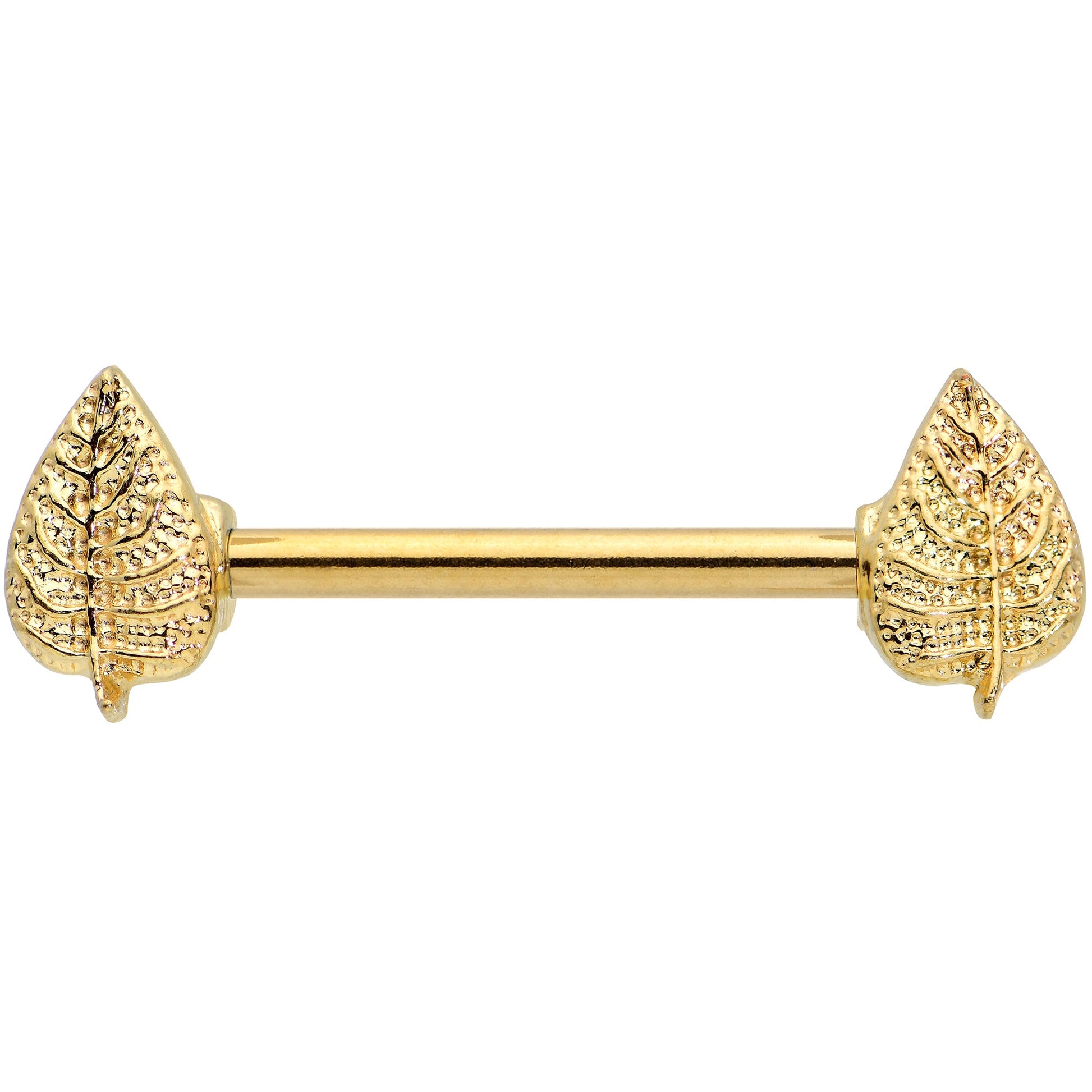 14 Gauge 9/16 Gold Tone Autumn Textured Leaf Barbell Nipple Ring Set