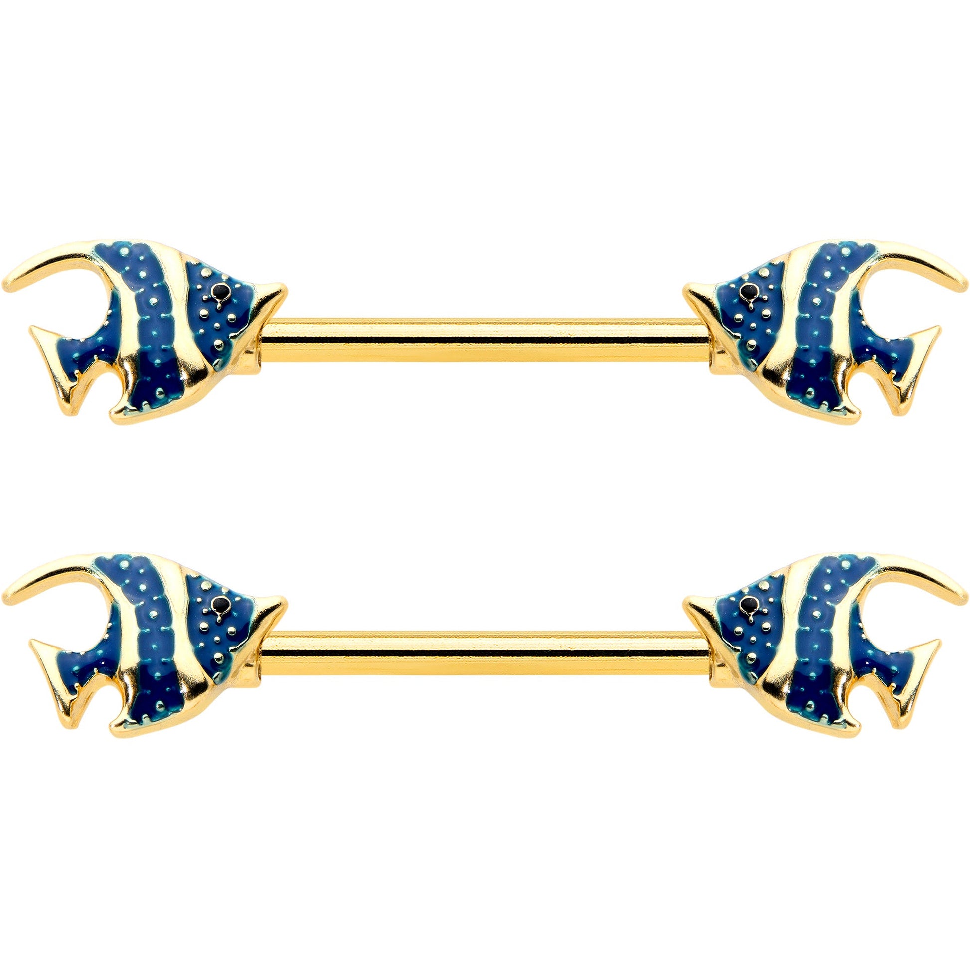 14G 9/16 Gold Tone Blue Stripe Adorable Angelfish Nipple Ring Set