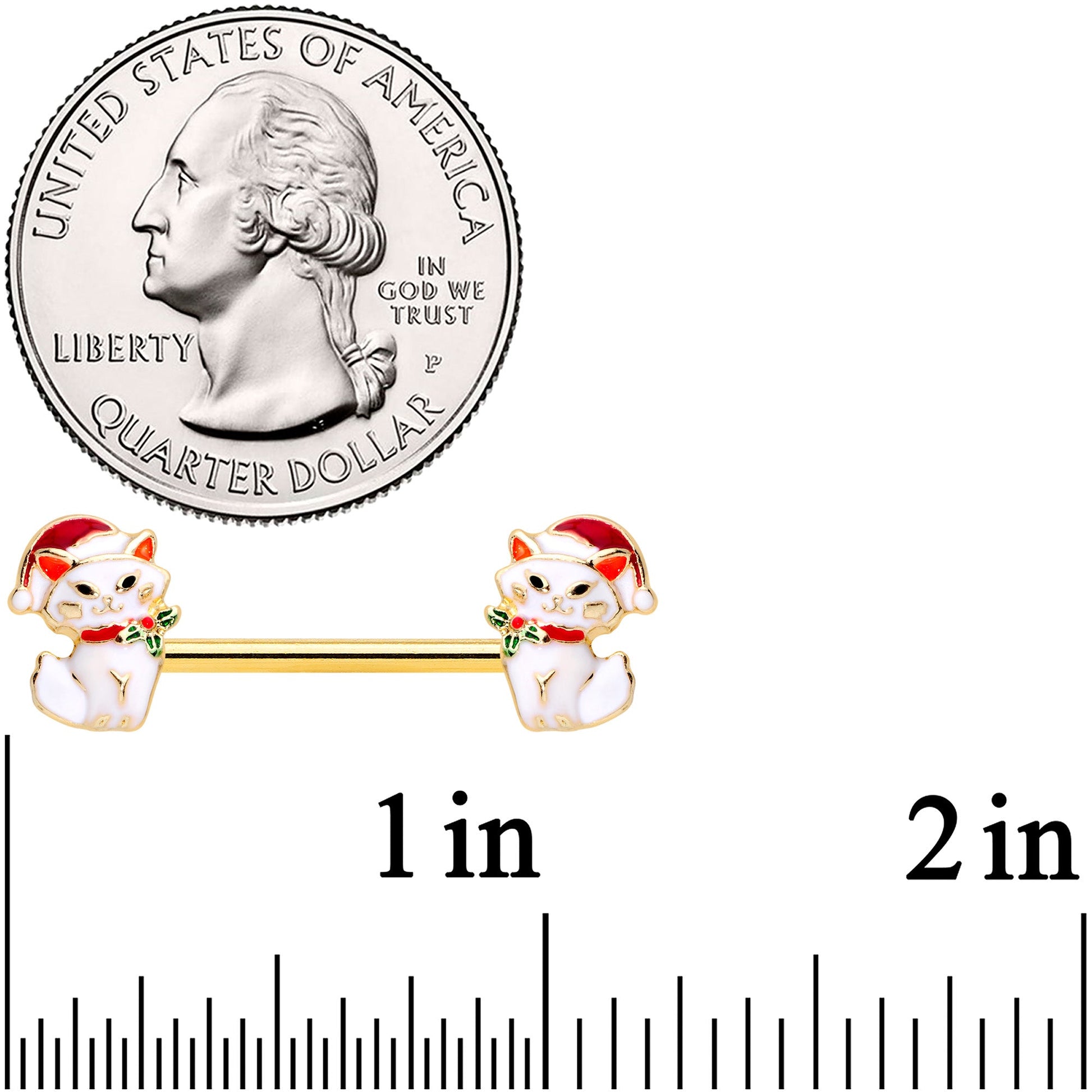 Someone's all dressed up and ready to deliver presents on this 14 gauge nipple jewelry! It's made with 14mm gold tone plated over 316L surgical grade stainless steel curved barbells. Each of the ends features a white cat charm, with a festive red collar. The cat is further embellished with a red Santa hat with white trim. This kitty Santa Claus is sure to sure to make your nipple piercings purr this Christmas with these festive, feline nipple rings! Sold as a set of two.Specifications