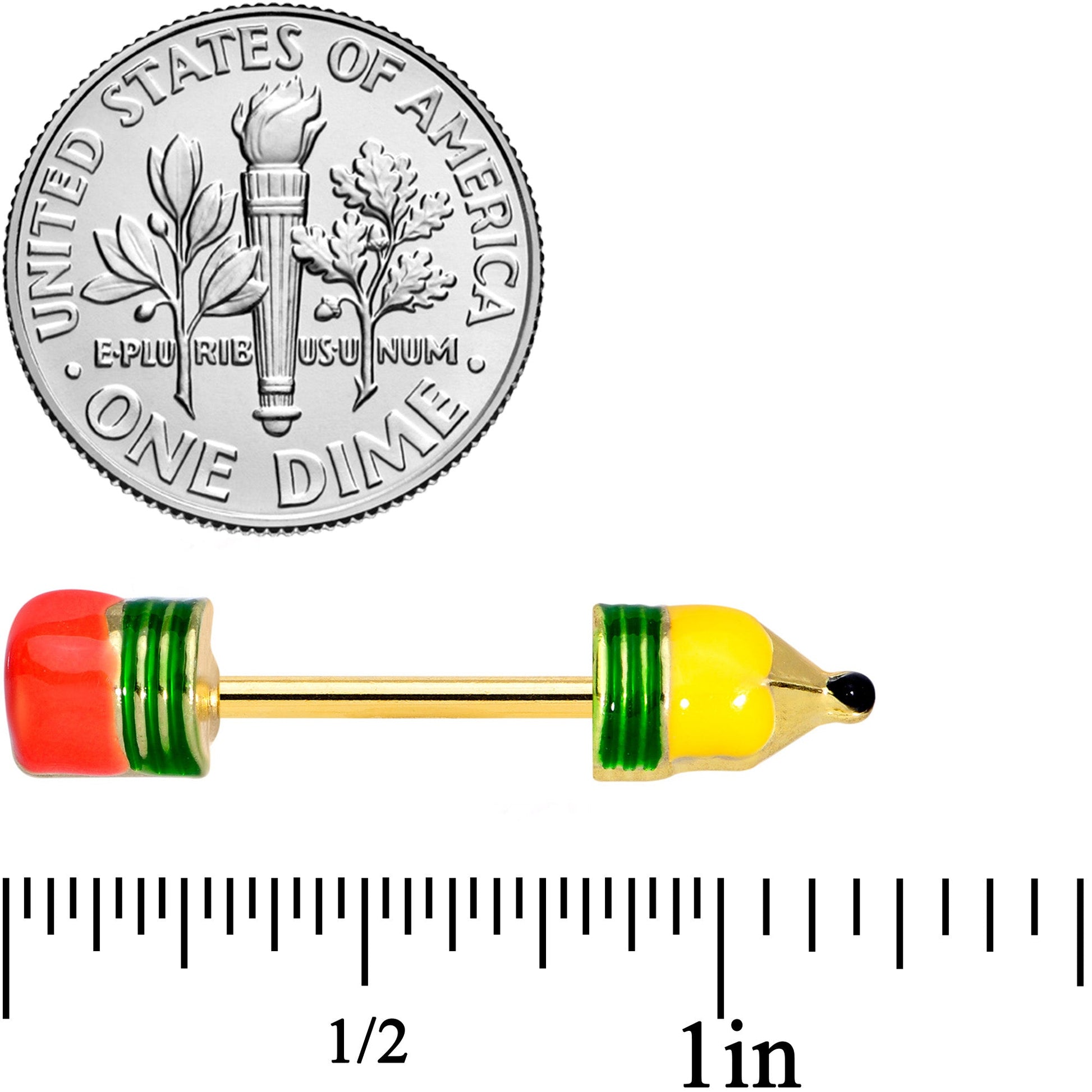 If you are always drawing or writing then these 14 gauge pencil nipple piercings rings are just right for you. Made with 14mm gold tone PVD over 316L surgical grade stainless steel straight barbells, this nipple jewelry features one pencil eraser charm end and one pencil point charm end for style you'll want to write home about! Sold as a set of two.Specifications