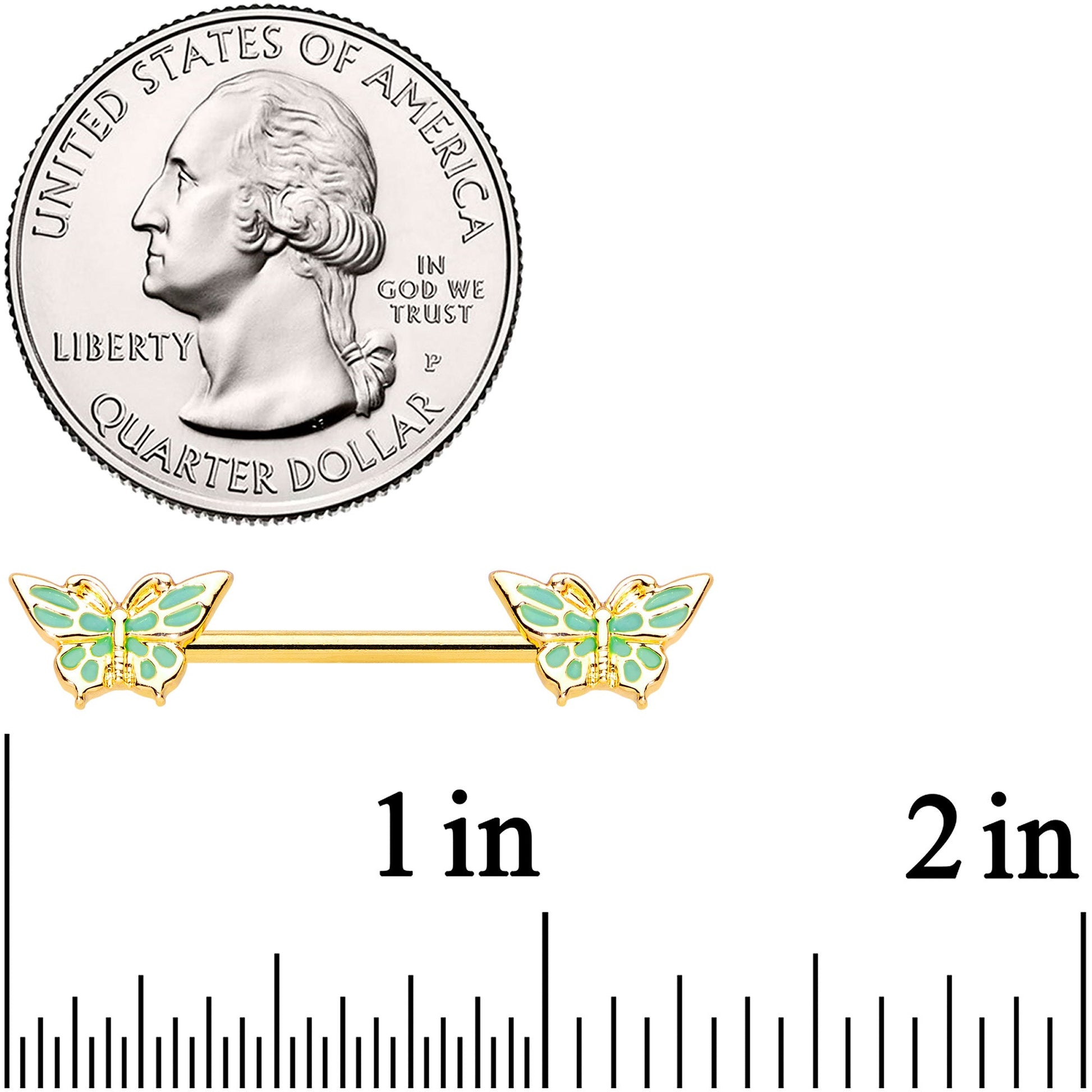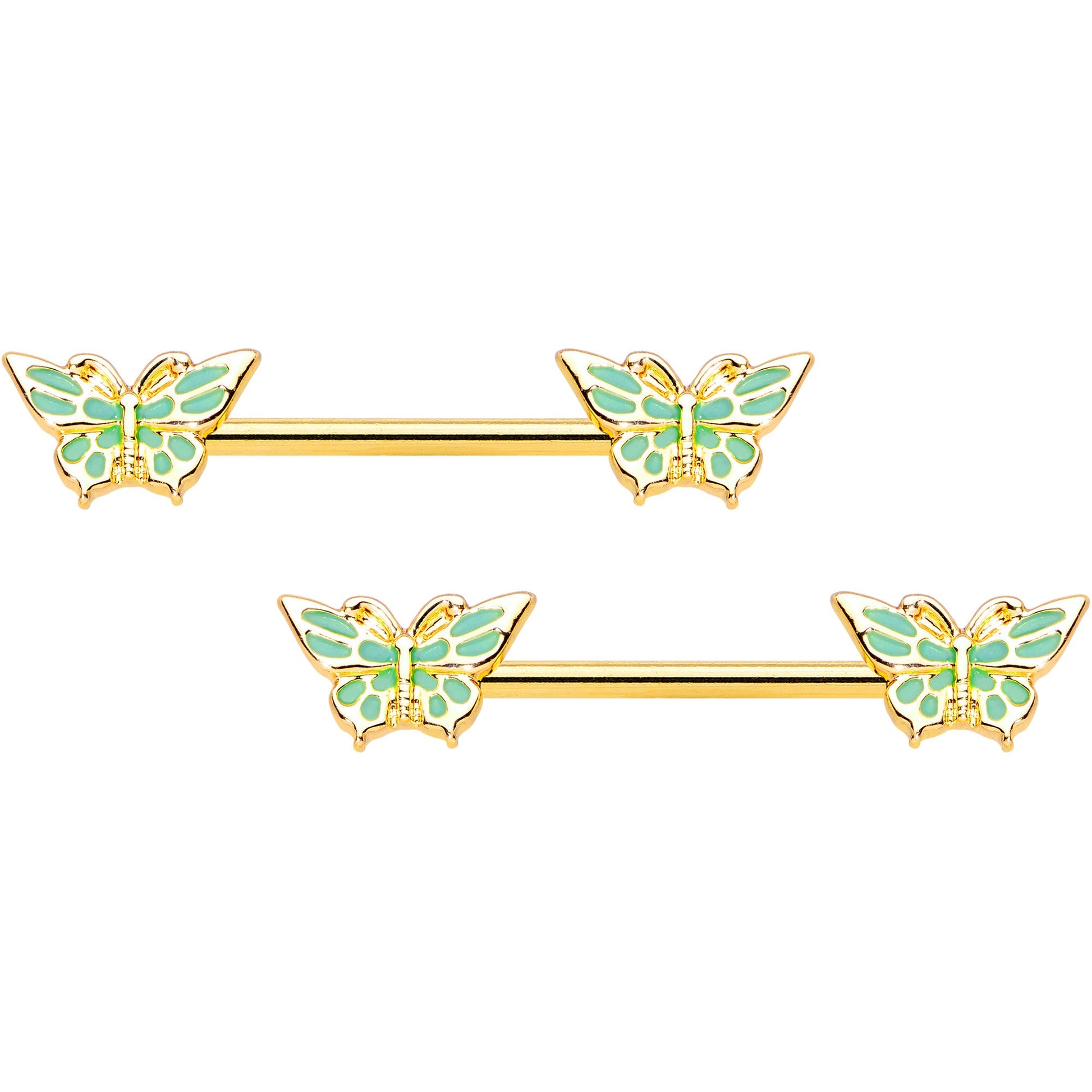 Go green and look beautiful doing it with this 14 gauge nipple jewelry! It's made with 14mm gold tone PVD over 316L surgical grade stainless steel straight barbells. Each of the ends features a butterfly charm with openwork designs on its wings. Underneath, green inlay adds color contrast and eye-catching detail to really set these apart from the crowd! Lift up your nipple piercings from the ordinary with these beautiful butterfly nipple rings! Sold as a set of two.Specifications