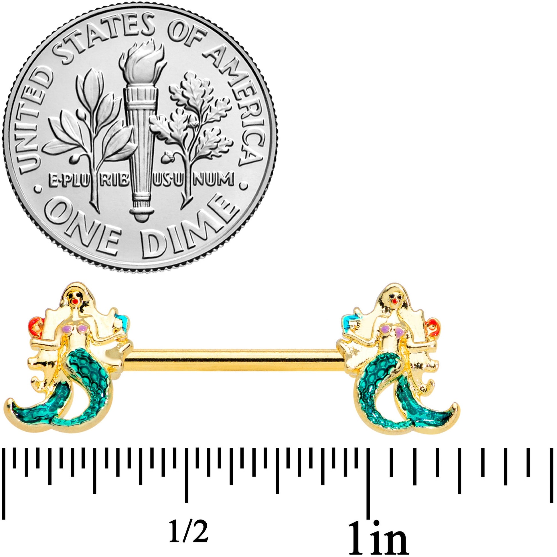Everyone knows about going green.....even under the ocean, like the mermaid on this 14 gauge nipple jewelry! It's made with 14mm gold tone PVD over 316L surgical grade stainless steel straight barbells. The ends feature matching mermaid charms with red and green embellishments at her shoulders. Her tail is also green and textured to emulate the look of scales. Now that is a fishtail with flair! This mermaid is sure to add her unique seashore style to your nipple piercings with this noteworthy, nautical, nipple jewelry! Sold as a set of two.Specifications